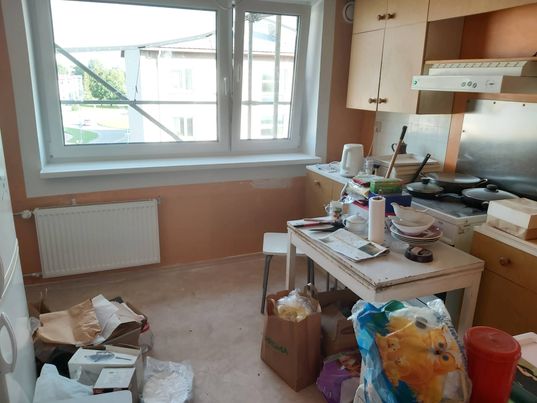 Köök (9,6 m2 )- seinad/lagi pinnad valmistada ette värvimiseks (pahteldamine jne), värvida, põrandalt eemaldada põrandapapp, vajadusel sirgestada, ca 1/2laminaatparkett ja ½ plaatimine, liistud, ukse paigaldus (vajadusel ukseava kohandamine).