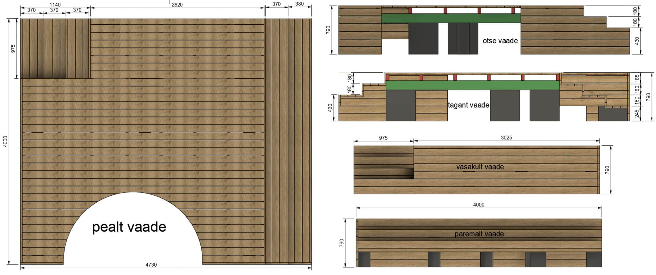 Minu koostatud projektijoonis koos kõikide mõõtudega on lisatud piltidena. Projektijoonisest ei pea rangelt kinni hoidma, vaid see on minu esialgne nägemus, et kuidas see lahendus võiks välja näha.