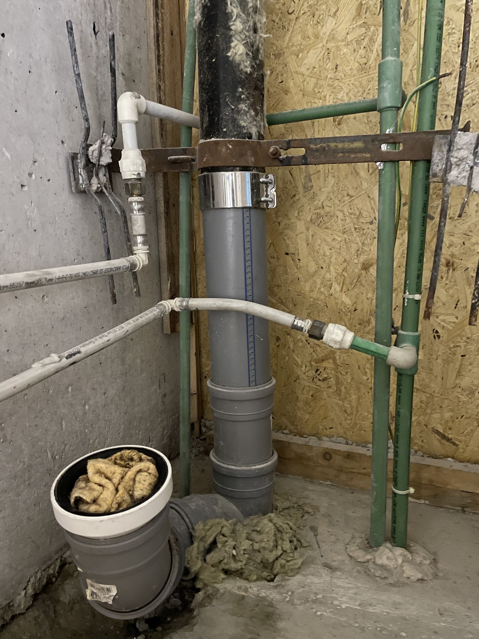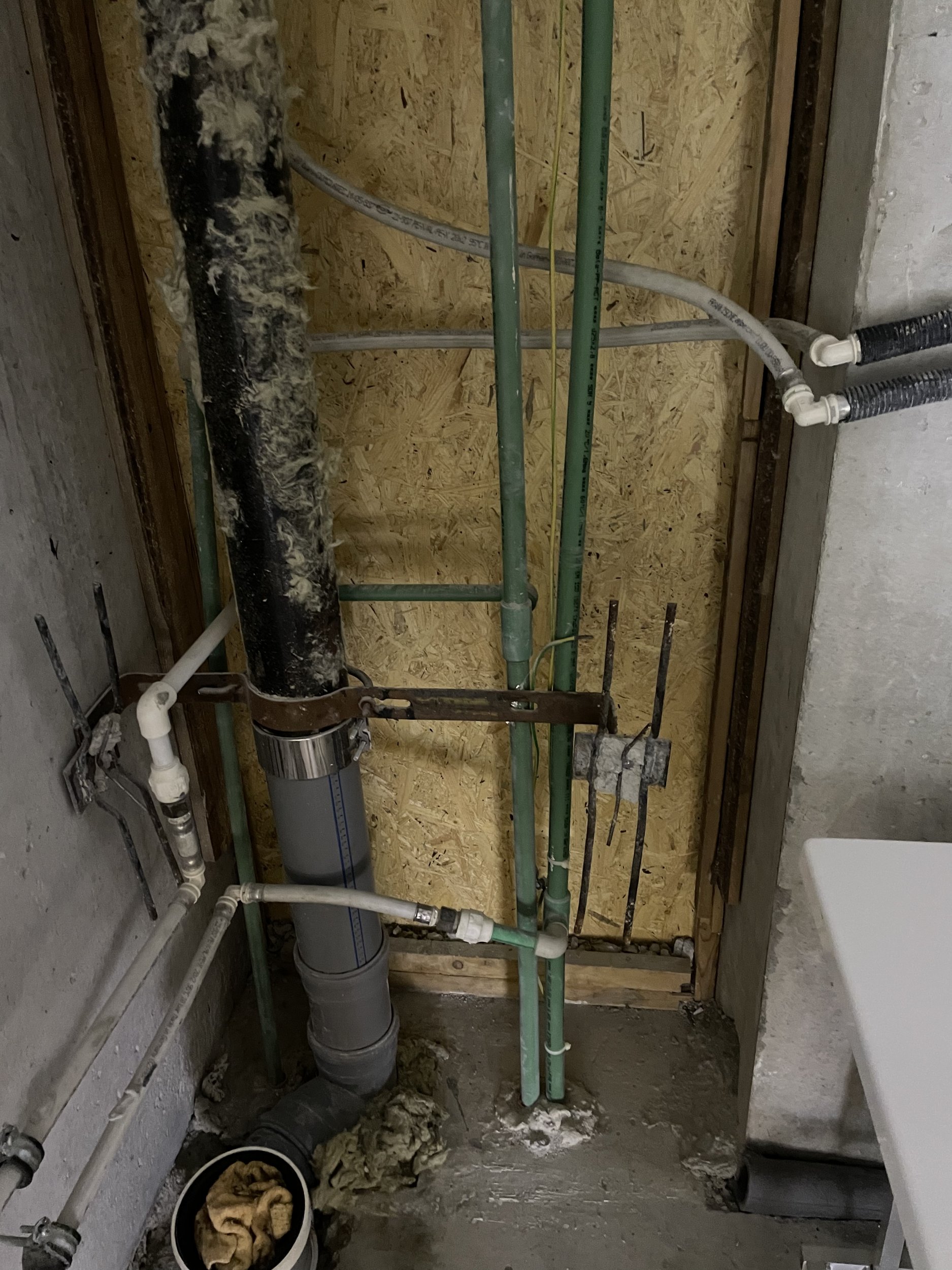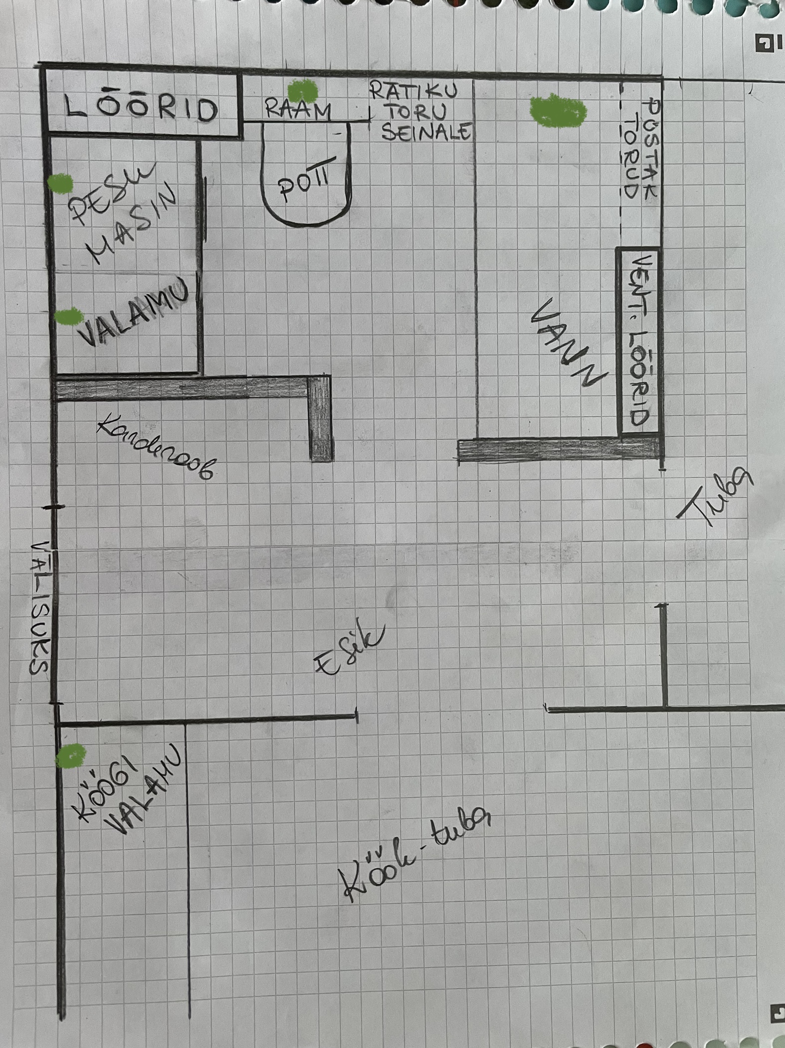 äravool vannist, wc potist, pesumasinast, vannitoa valamust, kööginurga valamust, trapist.(joonisel rohelisega märgitud kohad, trapp vanni all). Sooviks süsteemi, mis peidaks torud ära(põrand hiljem valatakse). Püstaku toru on viidud võimalikult madalale(fotol näha). Uued kanalisatsioonitorud on olemas, aga vajadusel võib juurde osta. Plaan on panna seinasisene wc-pott.