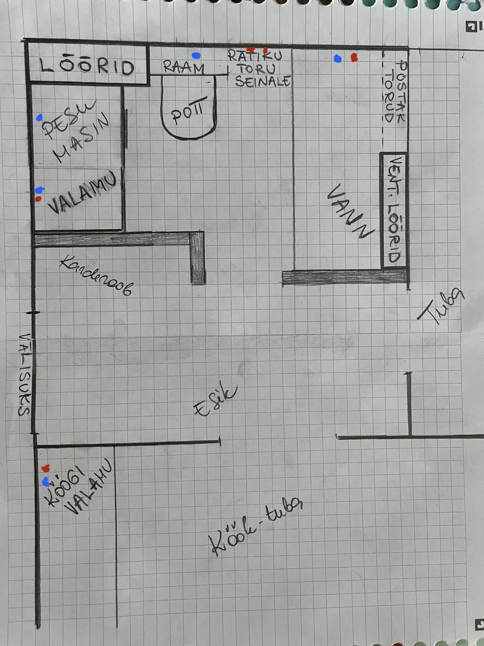 vannile, wc-potile, pesumasinale, vannitoa valamule, kööginurga valamule, rätikutorule(joonisel märgitud kohad- sinine/punane)