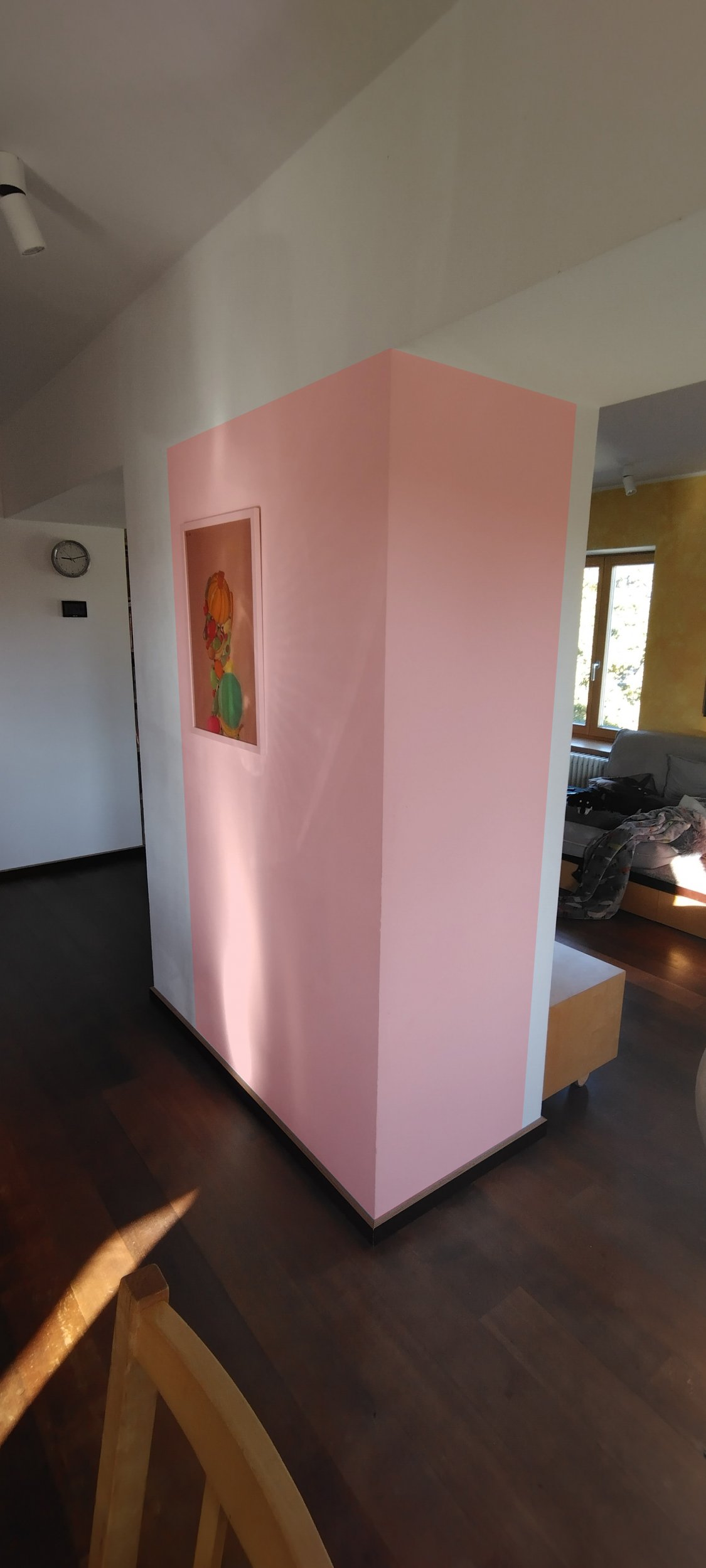 Oleks vaja krohvida/täis valada kaasasolevatel piltidel olev roosaga markeeritud seinaosa. Hetkel väljast kips, karkass (distantsi osas seinaga ei ole 100% kindel - lühemal küljel kindlasti 66 mm, pikemal küljel võib olla 100 mm, sest kaugemas otsas jookseb alla 50 mm kanalitoru), karkassi taga tellissein, mille sees veel omakorda kaks korstnalõõri. Eesmärk oleks karkassitühimik näiteks täis valada kipsiseguga, viimistluskrohvida samale tasapinnale, mis olol kips ning taastada värv (ver. A - olol värv, struktuurne lubivärv; ver. B - kogu seina osas - ka talad - valge matt seinavärv)