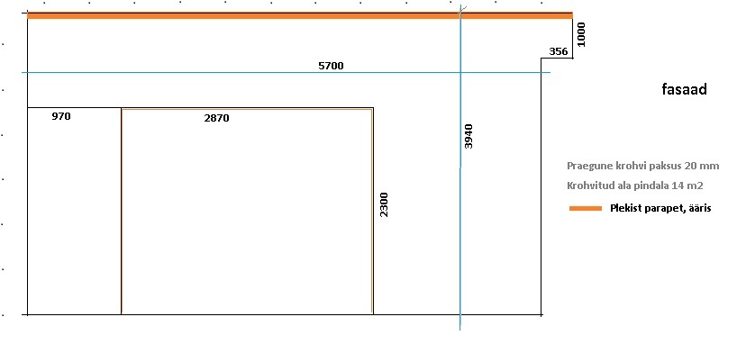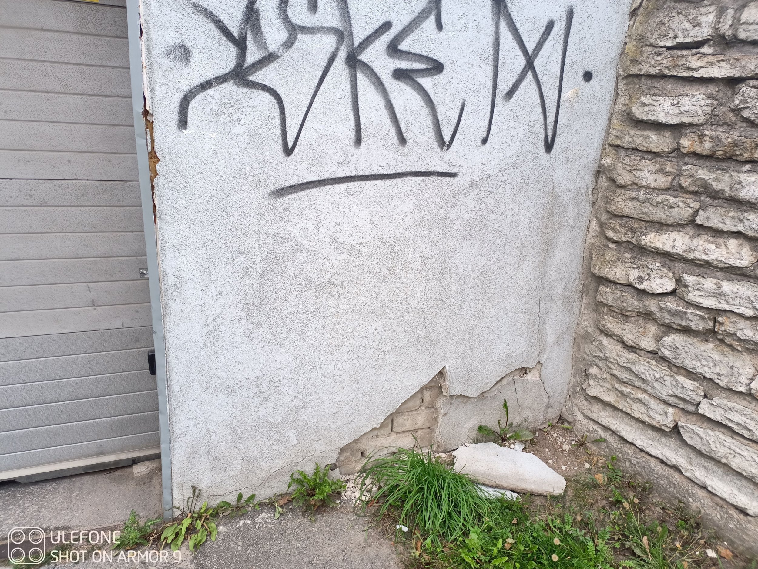 Fasaadi (14 m2) lahtise krohvi eemaldamine (võimalik, et kogu krohvi), krohvimine võrkarmatuurile (nagu kõrvalhoonel näha) ja viimistlemine/värvimine. Eemaldatud krohvi utiliseerimine - kuni 0,3 m3. Parapeti ja ukseservaplaekkid tuleb korralikult eemaldada, sirgestada ja tagasi panna. Silmas pidada, et suurt ukseava ei saa sulgeda, kuna selle kaudu toimib aegajalt garaazi sisse ja väljasõit..