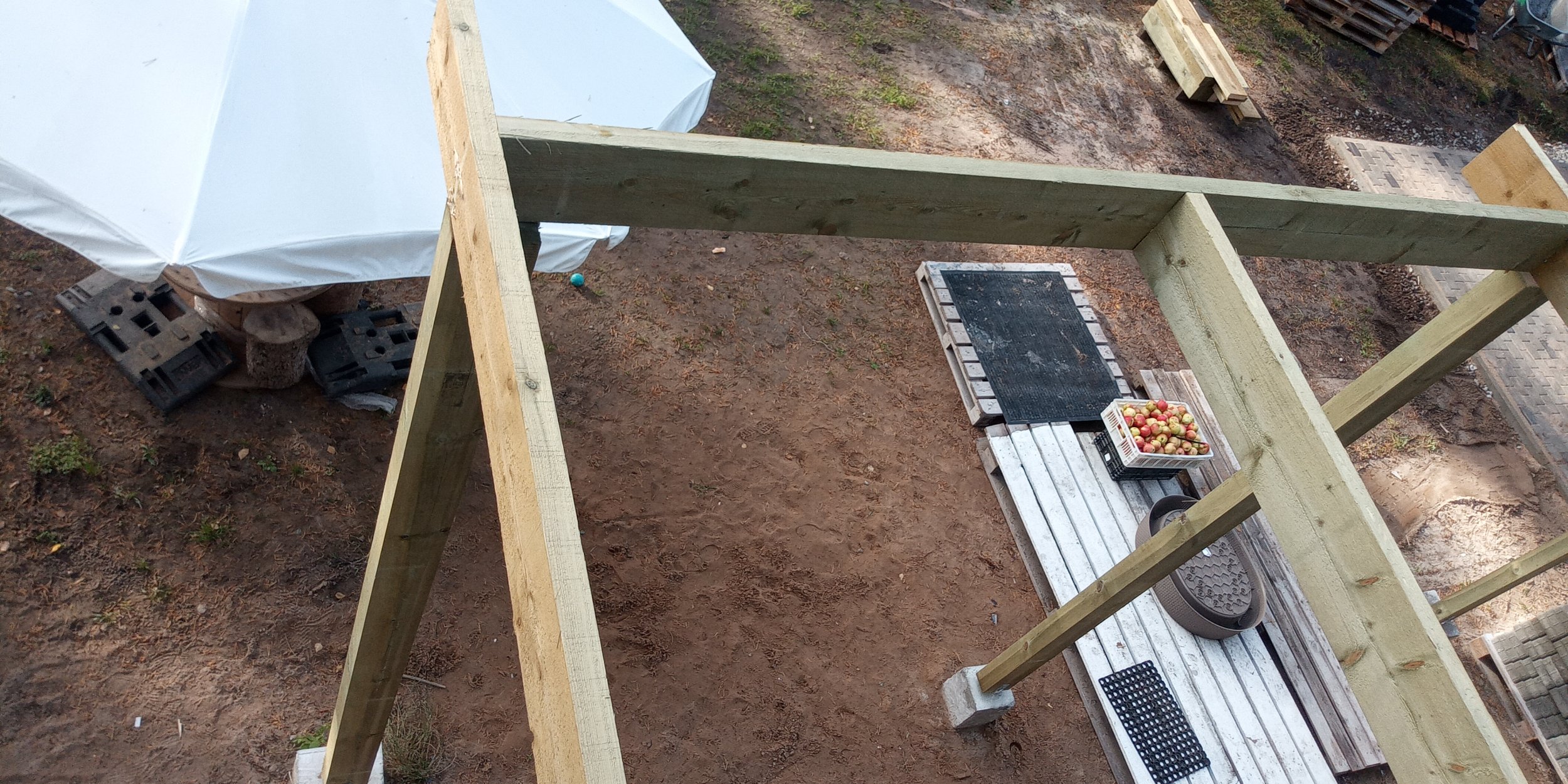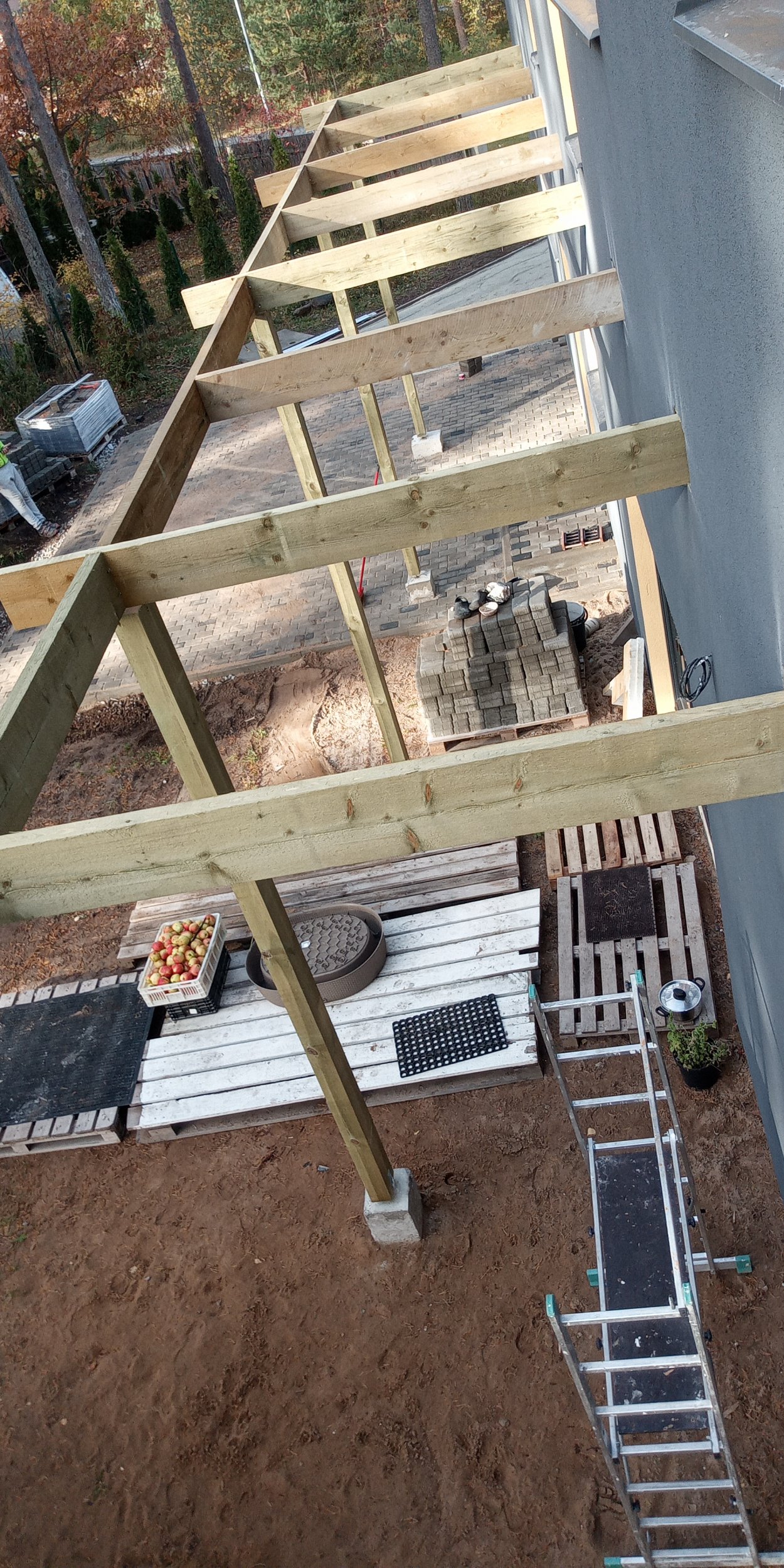 Tööd on juba alustatud Kandeposte 5tk, sammuga 3,4m, 100x150mm imm puit. Peatala kaugus maja kiviseinast on 2m. Iga kandeposti juurest läheb tala, mis kinnitub hoone betoonseina külge prussikingaga. Lisaks on iga kandeposti vahel samuti kinnitustala. Peatala 50x200.