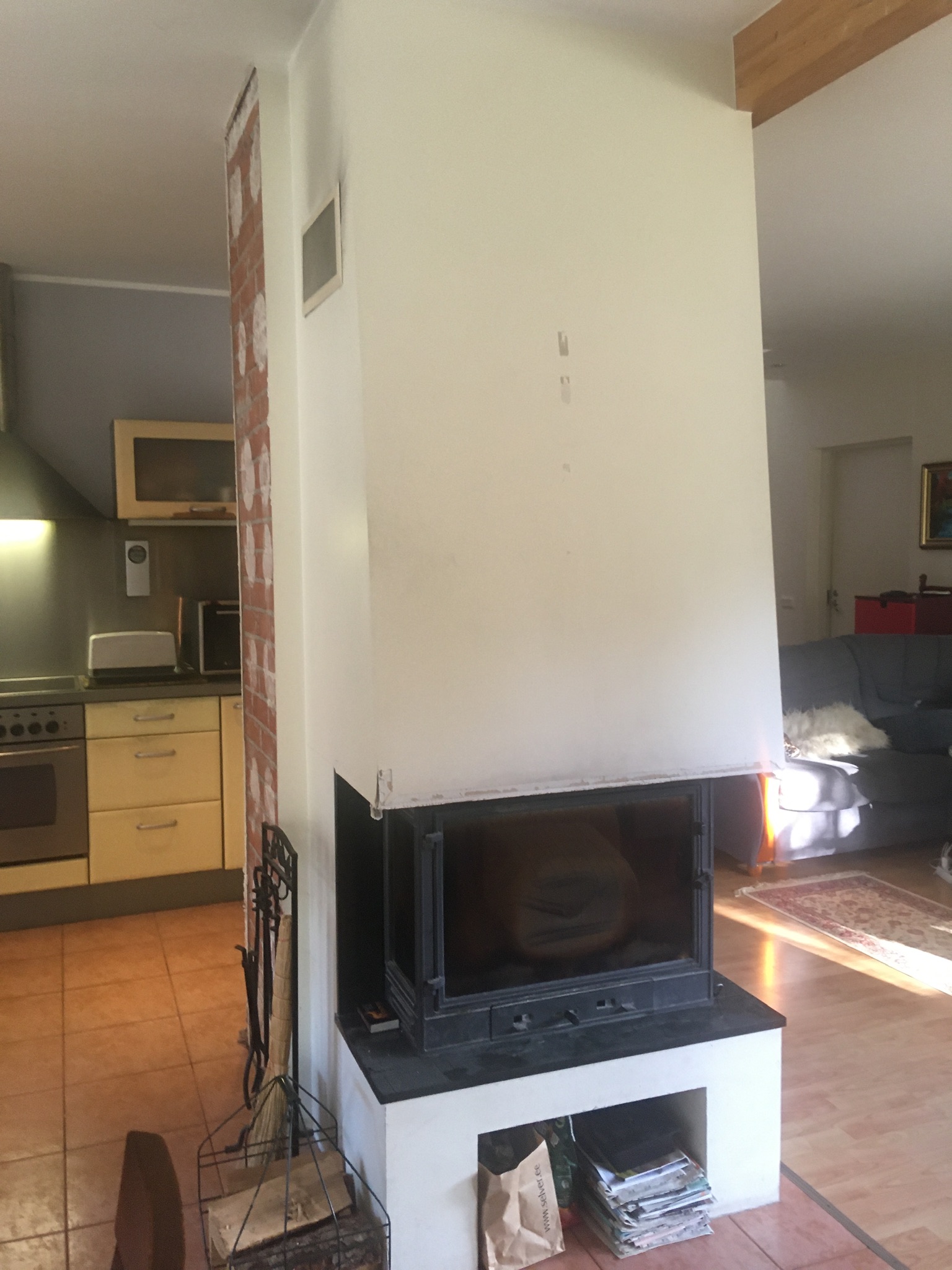 Eramaja Raudalus, Tallinna Nõmme linnaosas. Praegu kipsplaadiga kaetud kaminale tuleb uus korralik kate teha. Korstnajala ühelt küljelt on kipsplaat juba eemaldatud ning see külg tuleb ka katta. Hange sisaldab nii projekteerimist kui ka ehitamist.