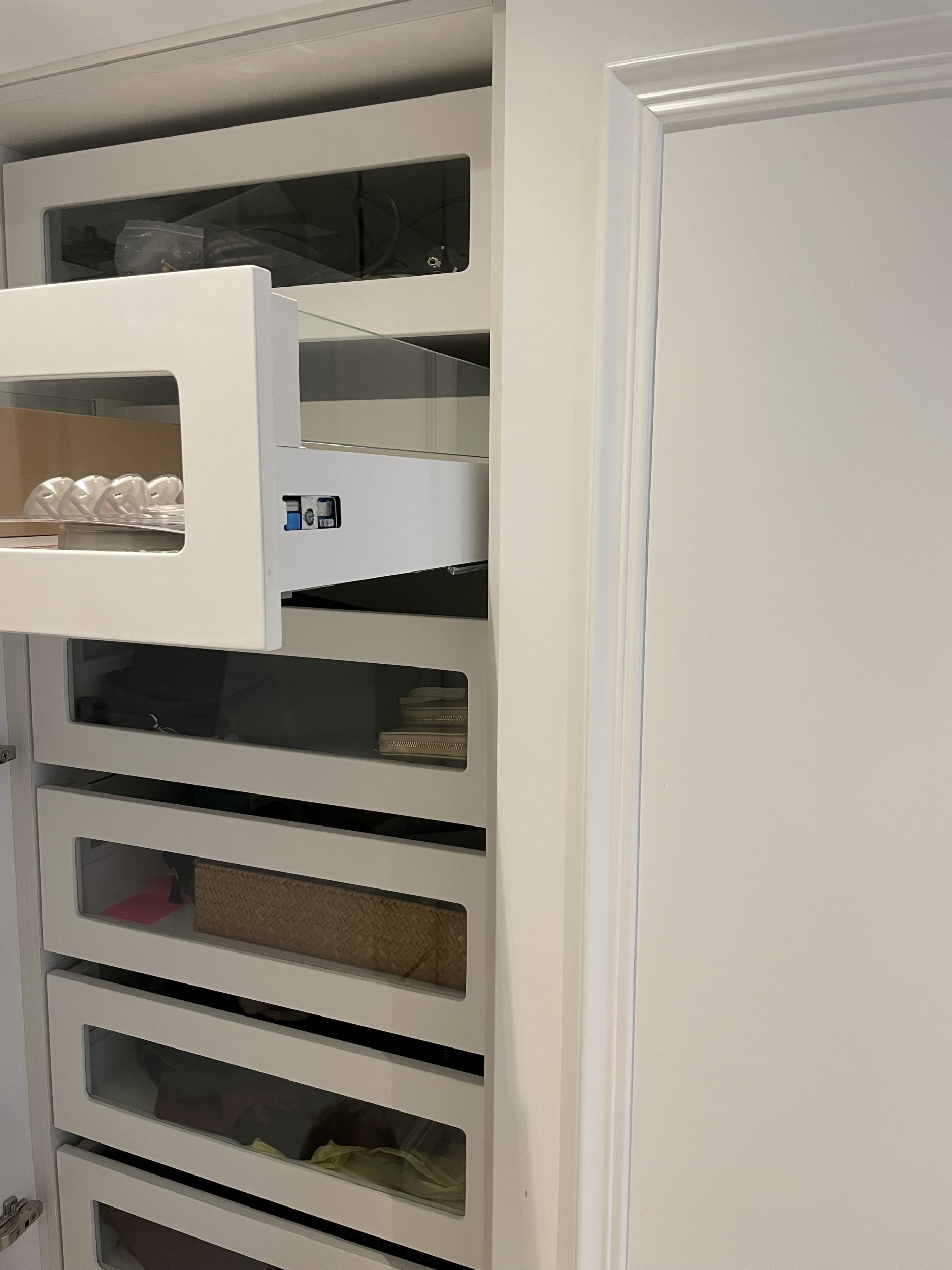 Riidekapi sees olevad sahtlid ilma käepidemeteta (sahtlite esipaneelide vahed nt. 30 mm nagu meil esiku kapil). Väikese sahtliboksi sahtlite esipaneelid ja küljed klaasiga (nagu meil esiku kapil ning avamine nagu muudel sahtlitel, pilt manuses). Kõik sahtlid soft-close.
