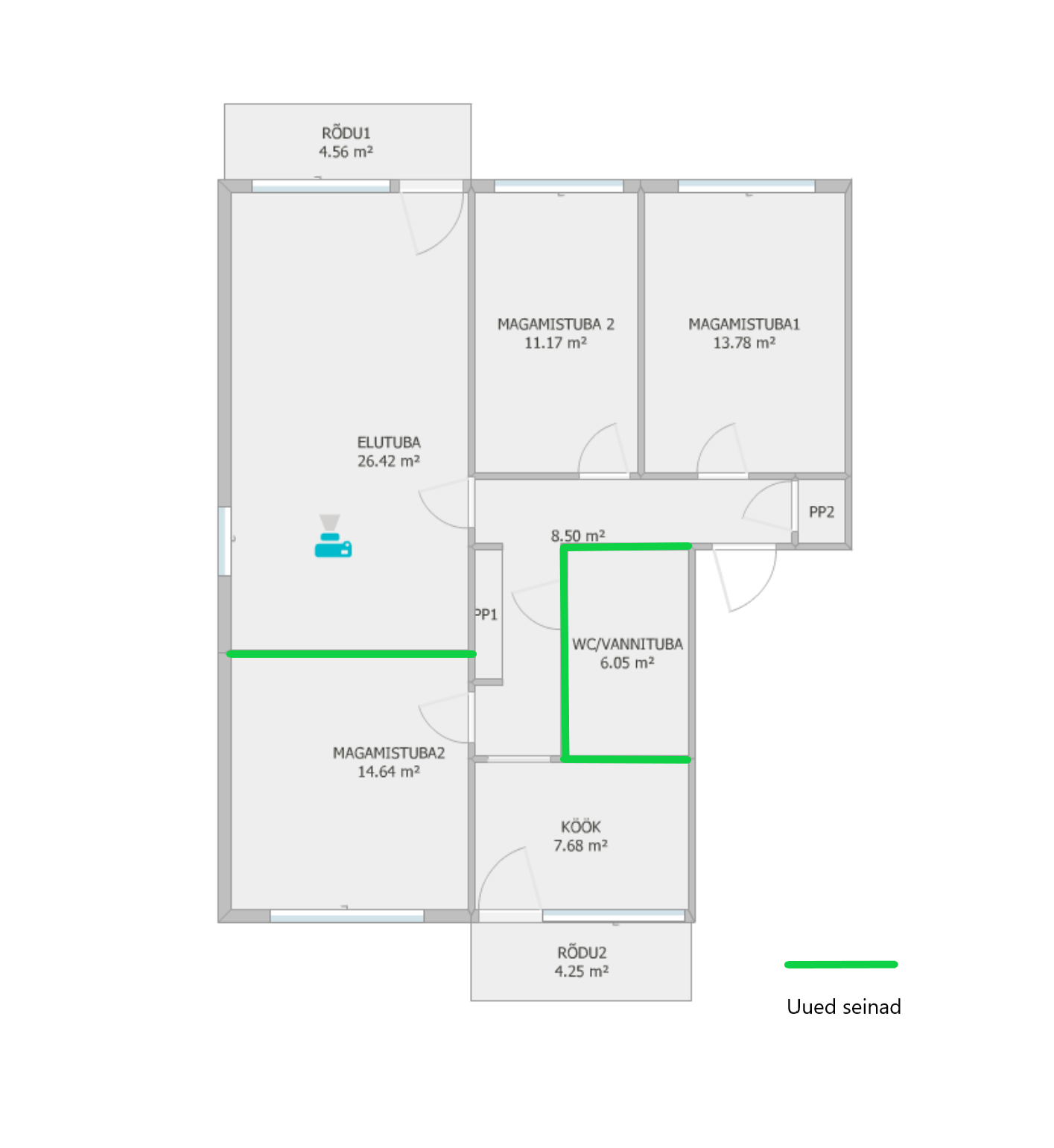 *Seinakarkassi ehitus ja kipsplaadi paigaldus (ruumi asukoht sama, vanad seinad lammutatud, kanalisatsiooni püstaku/veetorude ühendus loodud)