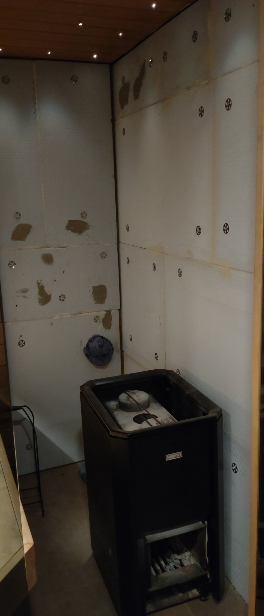 Saunas leiliruumi sein 5m2 liimida olemasolevale kaltsiumsilikaatplaadile dekoratiivkivid Stegu Madera. Seinal on ka sisenurk.