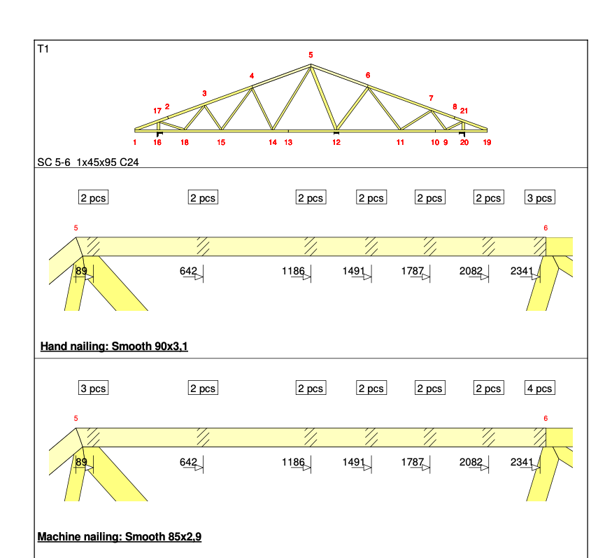 Üks 45x95, c24 tugevduspruss fermi kohta punktide 5 ja 6 vahele, vastavalt joonisele, naelutatud. Kokku 18 femi. Sisaldab materjale ja tööd.