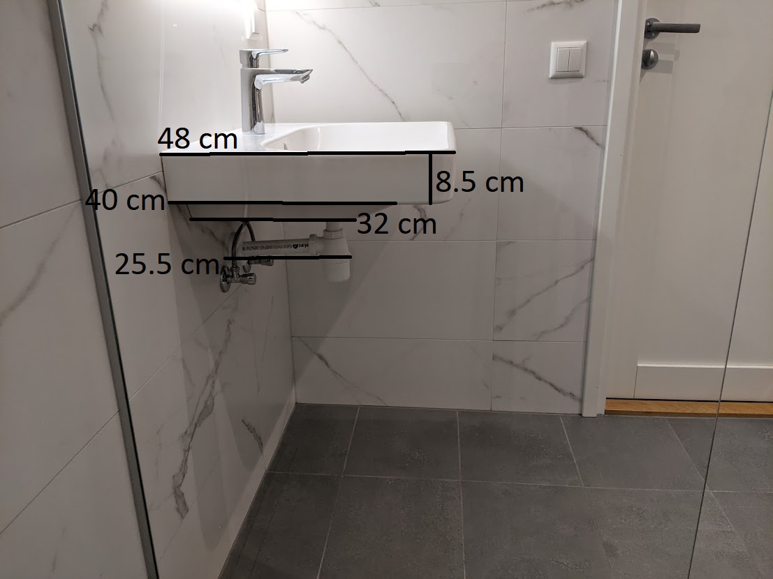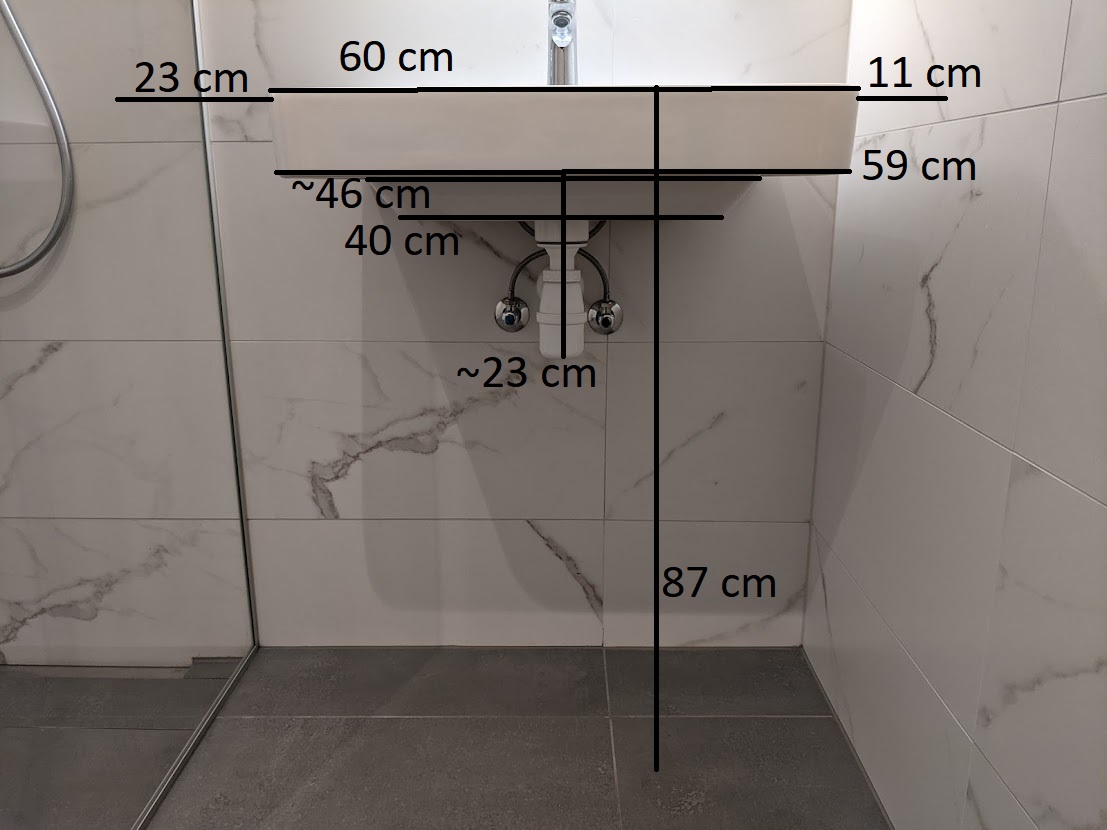 Valamu laius 60 cm, sügavus 48 cm. Kõrgus põrandast valamu ülemise ääreni 87 cm. Dušiklaasi ja valamu vahe 23 cm. Seina ja valamu vahe 11 cm.