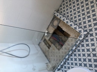 Dušialus on avatud, et selgitada lekke põhjus. Tänaseks on asi selge ning põhjus kõrvaldatud ja tuleks paigaldada dušialus ning vahesein.