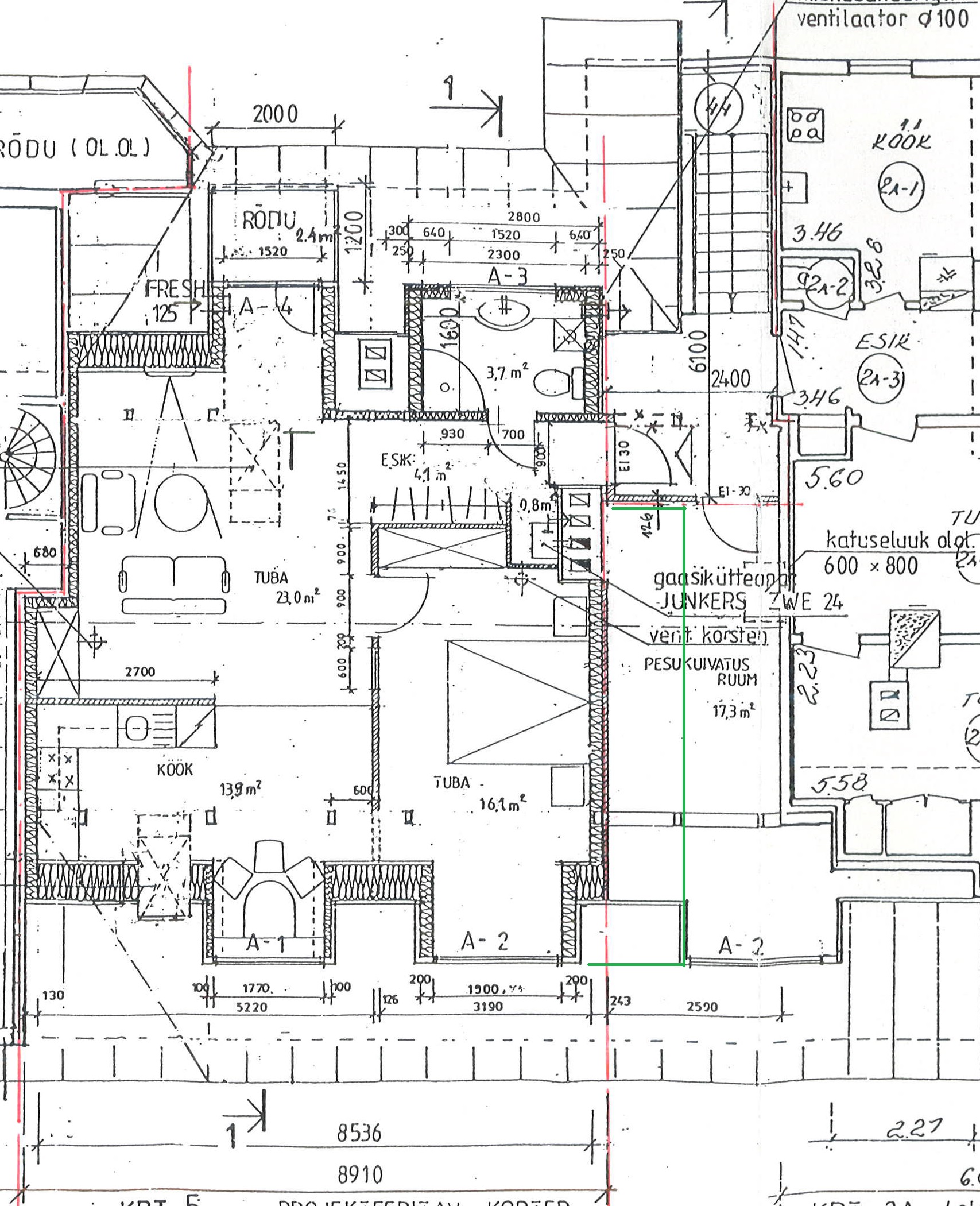 Soov laiendada olemasolevat pööningukorterit umbes 5m2 võrra (pildil märgitud rohelise joonega). On vaja koostada uus projekt mille alusel saab notaris lisanduva pinna ostu vormistada ja hiljem KOV juurdeehituse seaduslikult vormistada.