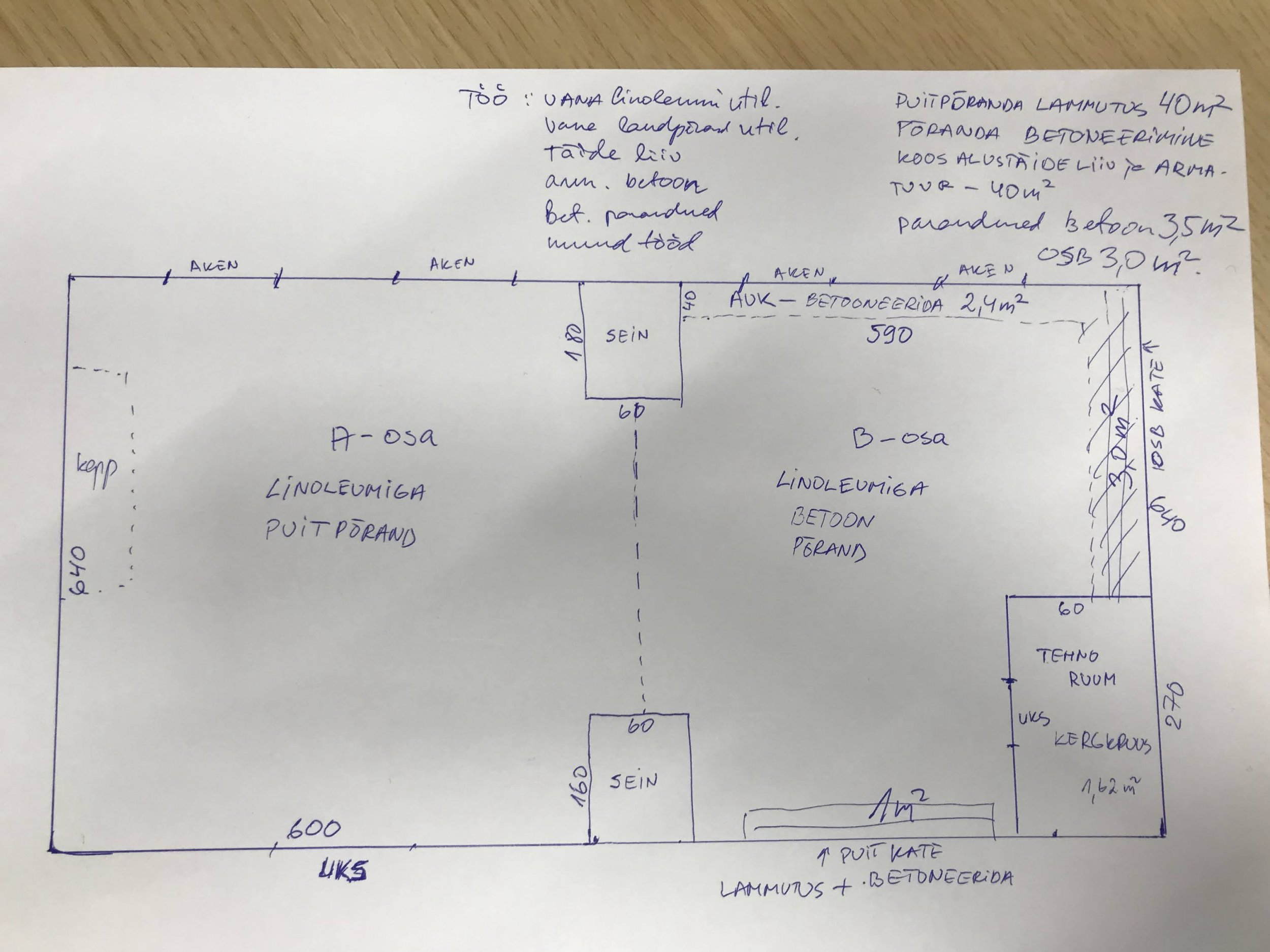 3. Teine pool ruumi (A-osa) on linoleumkattega puitpõrandaga, mis tuleb täielikult lammutada ja jäätmed utiliseerida. Puitpõranda asemele rajada betoonpõrand vastavalt mahutabelile.
