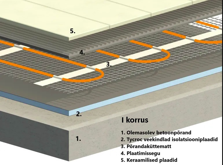 5. Põrandaküttemati paigaldus + põranda tasandusvalu + plaatimine 30x60 plaat.