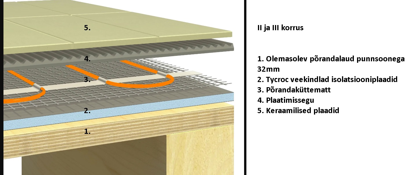Seinte ja põranda ehituses kasutatakse veekindlat Tycroc plaati. Seinad plaaditakse osaliselt ning osaliselt värvitakse.