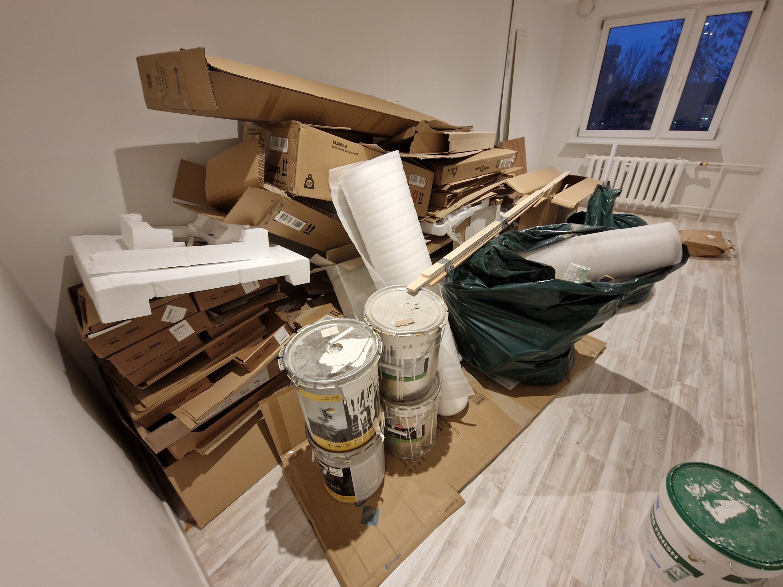 Viia ära praht ning utiliseerida. Valdavalt IKEA köögi pappkastid, mõni värv ja vähemal määral muud sodi. Asukoht 5 korrus mustamäel.