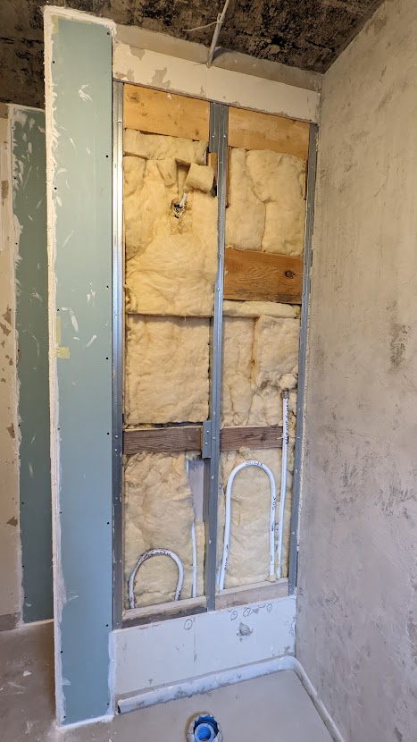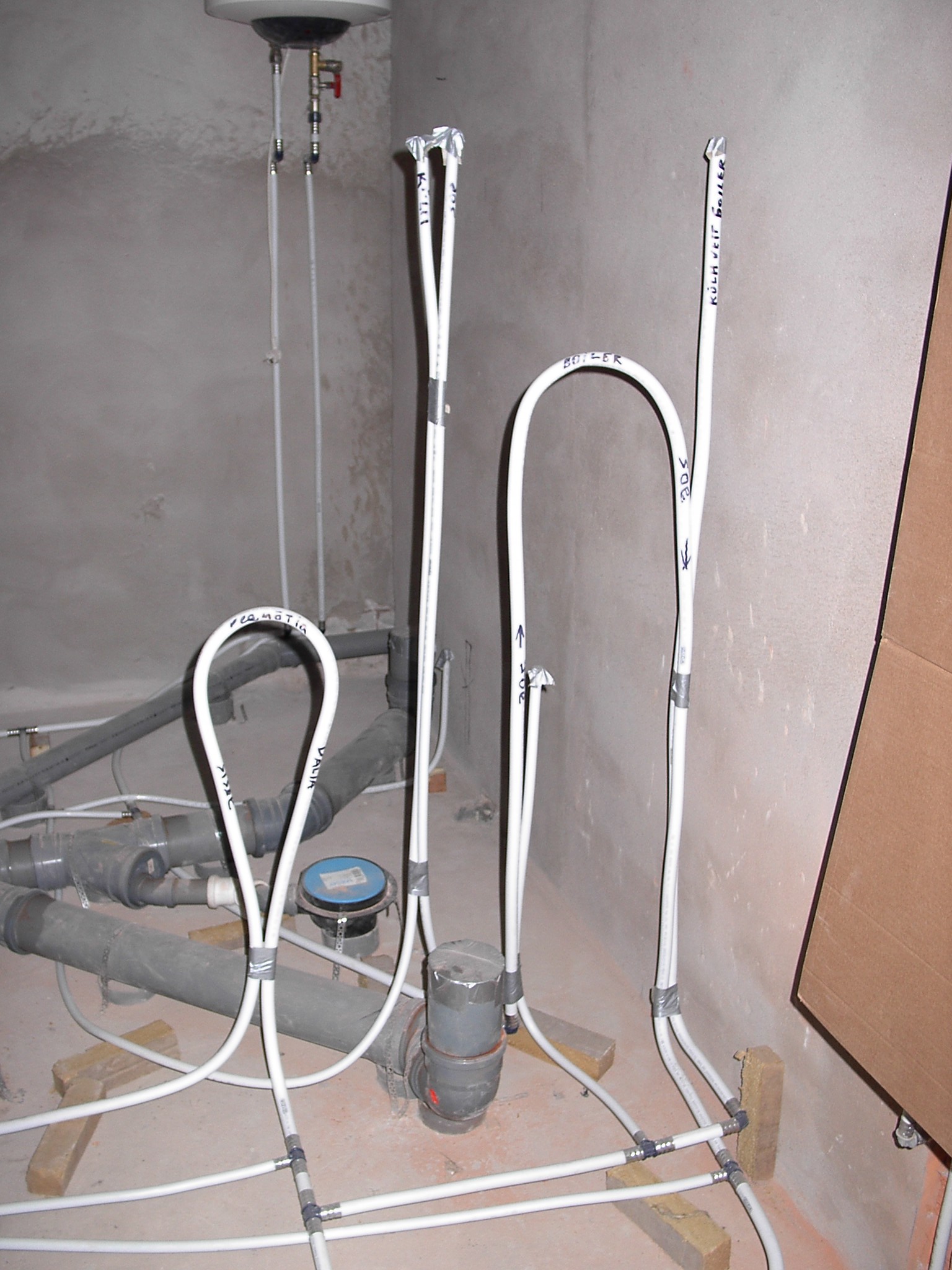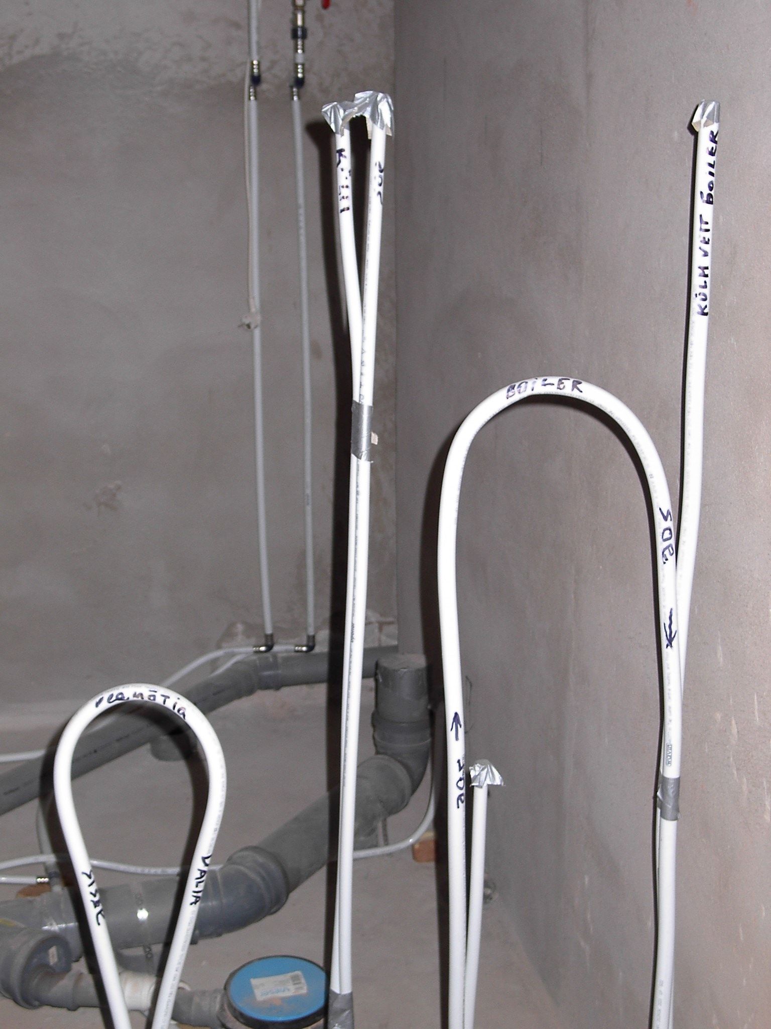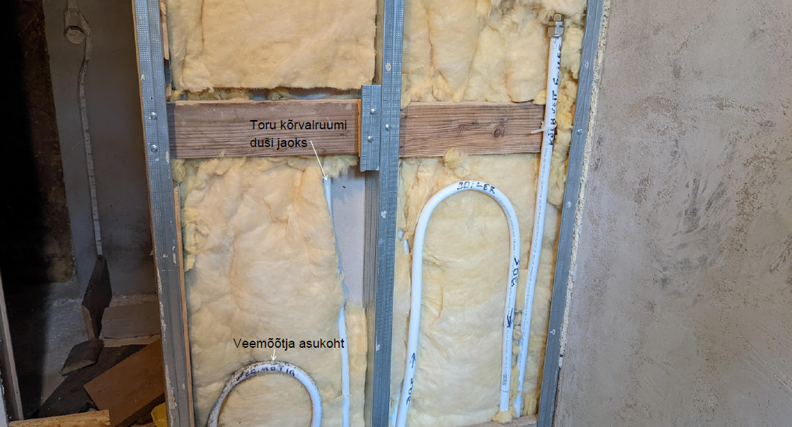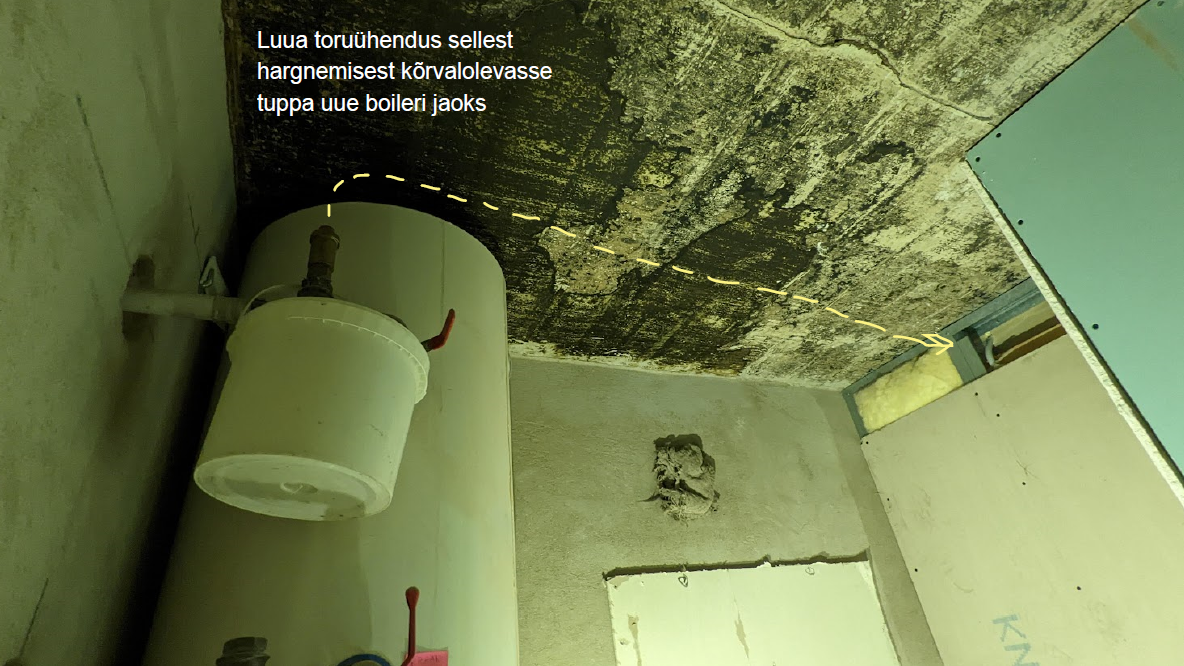 3. 2-süsteemse vertikaalse boileri paigaldamine seinale (arvestades soojuspaisumist) ja ühendamine olemasolevasse küttesüsteemi. Boileri maht on 80 l või 100 l ja boiler on tellija poolt. Ühendamaks boiler küttesüsteemiga on vaja vedada toru kõrvaltoast lae alt läbi avatud kipsvaheseina ligikaudu 1,8 meetri kauguselt (seletus pildil). Karkassi peale tuleb 2-kordne kipsplaat, kipsplaadid seina ette on olemas.