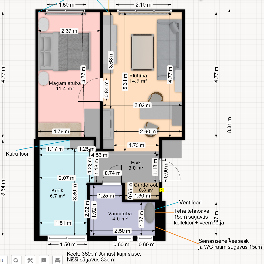 * Esik, köök, magamistuba mustpõrand (22m2)