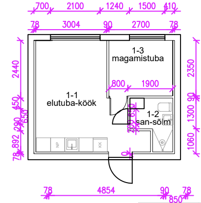 Enne ehitustööde algust plaanin ära utiliseerida ülesvõetud põrandad. Siis saan teha ka uued pildid. Mõõtudega joonisel on magamistoa ukse asukoht eksitav. Uks tuleb välisseina äärde. Wc-pott on plaanitud seinaseisene ning asetusega vannitoa magamistoa poolsesse seina.