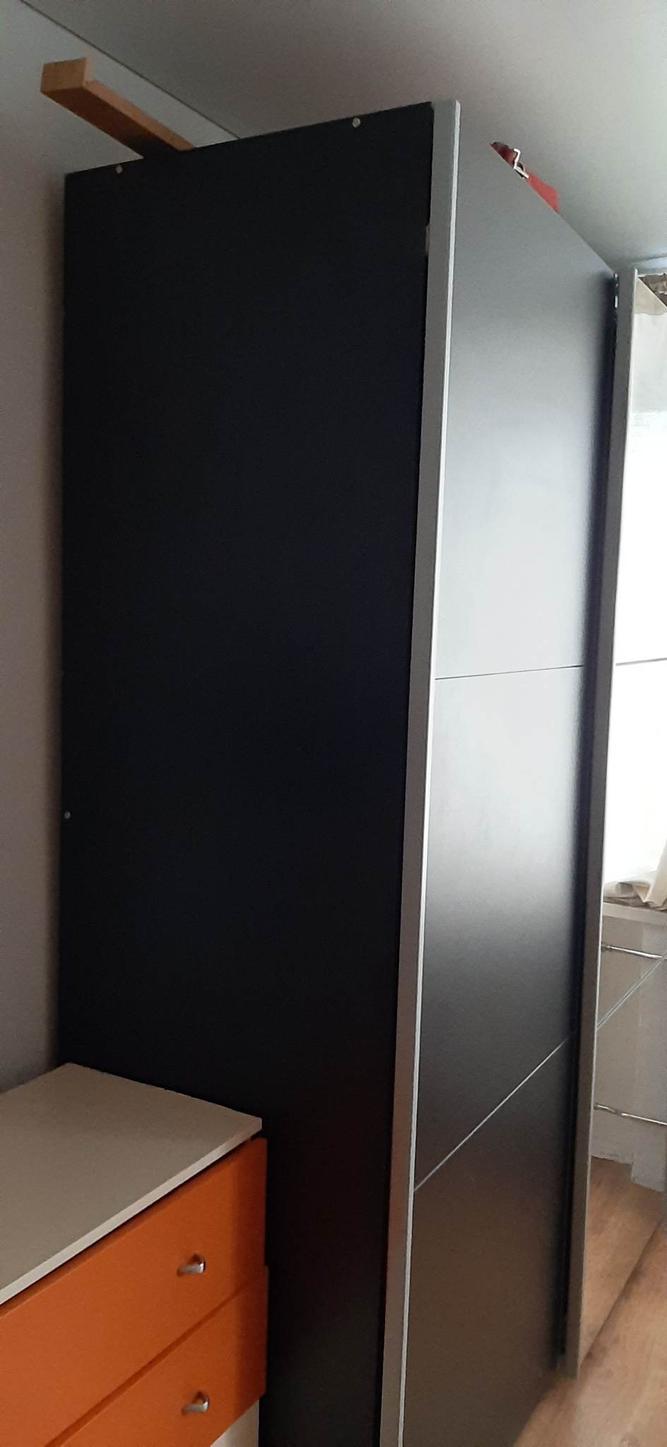 Sees on ka suur MDF materjalist riidekapp, mis tõenäoliselt ilma lahti lammutamata toast välja ei mahu, võib olla saab kahekesi liigutades välja. Uksed saan küljest võtta ja riided välja, lihtsam liigutada.