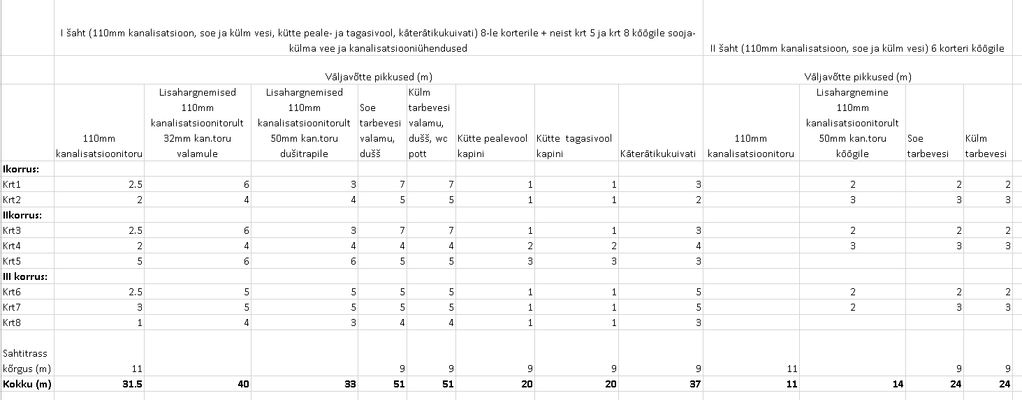 1. Vannitubade kanalisatsiooni torustiku, kütte ja tarbevee vedamine esimeses šahtis 8-le korterile. Kahele korterile nr 5 ja krt8 köögi sooja-külma vee ning kanalisatsiooni tekitamine esimesest šahtist.