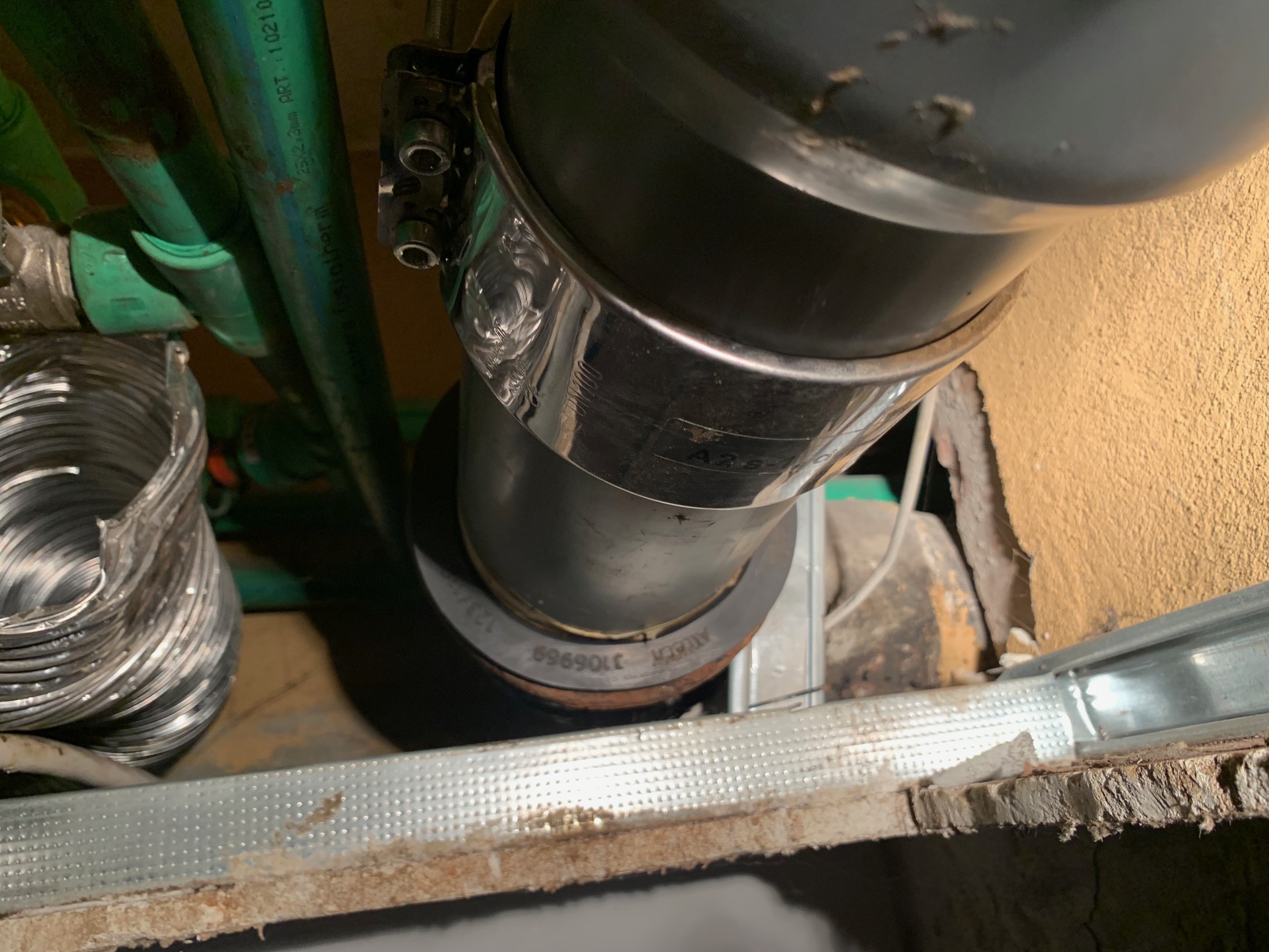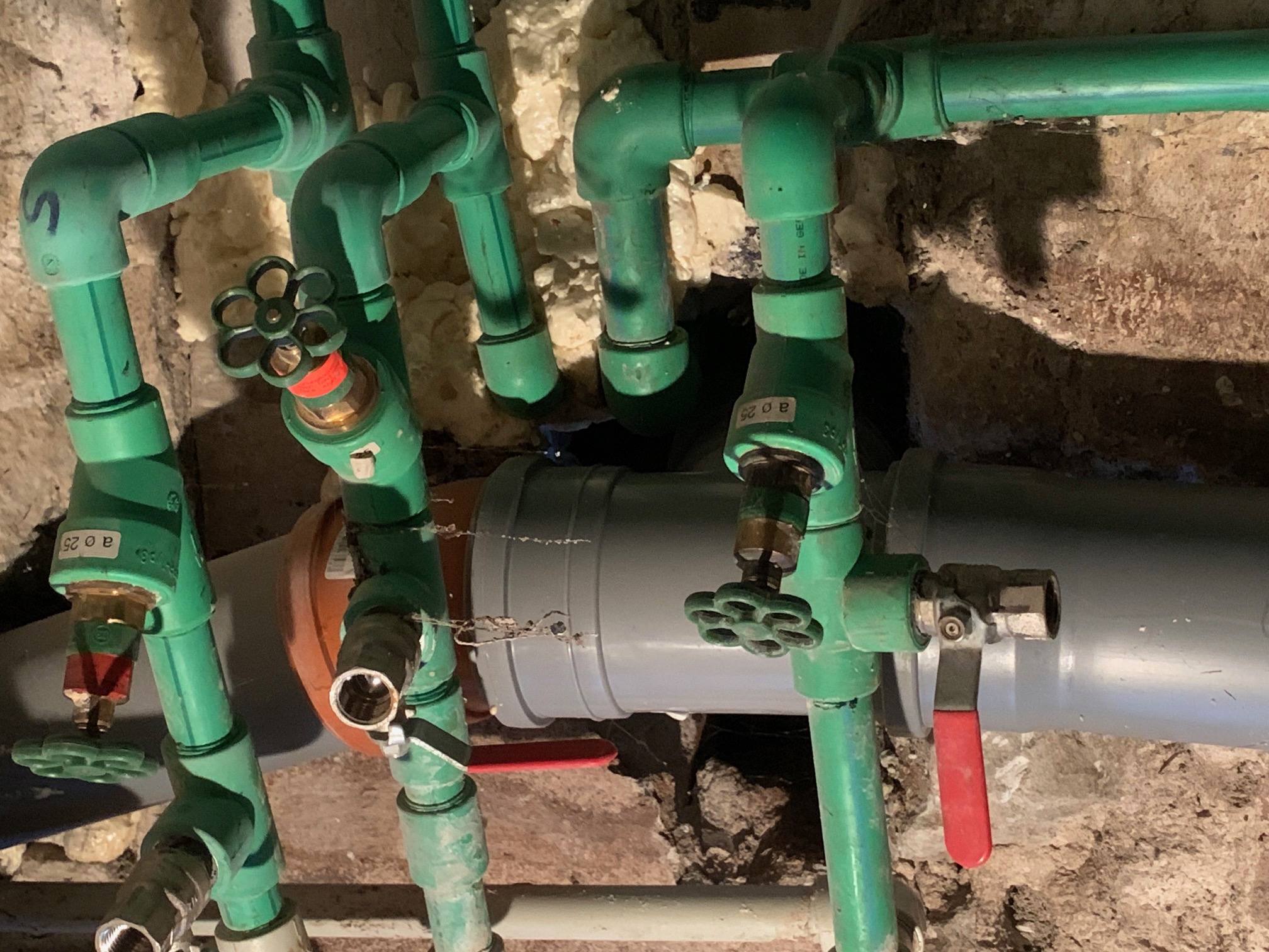 Edasi pöörab toru seina sisse (vaata teist pilti) ja ühendub seina taga oleva vertikaalse püstakuga (vaata kolmandat pilti). Seina tagusel püstakul on ühenduskoht plastikust olemas, seega seina sisse tuleb sirge toru (ei ole vaja midagi lammutada jne). Seinatagune vertikaalne püstak on osaliselt kaetud vee- ja küttetorudega (vt neljandat pilti), kuid see ei tohiks tööd segada, kuna seda püstakut ei ole vaja ümber ehitada - ainult ühendada seinasisene jupp olemasolevasse ühenduskohta.