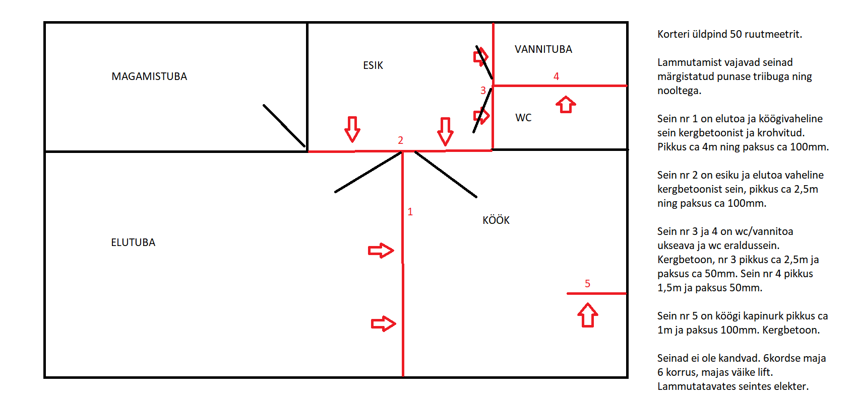 Lammutamist vajab korteri tubasid eraldavad vaheseinad elutoa ja köögi vahel ning wc ja vannitoa vahel, samuti köögi kapinurk ja esiku/elutoa vaheline eraldussein.