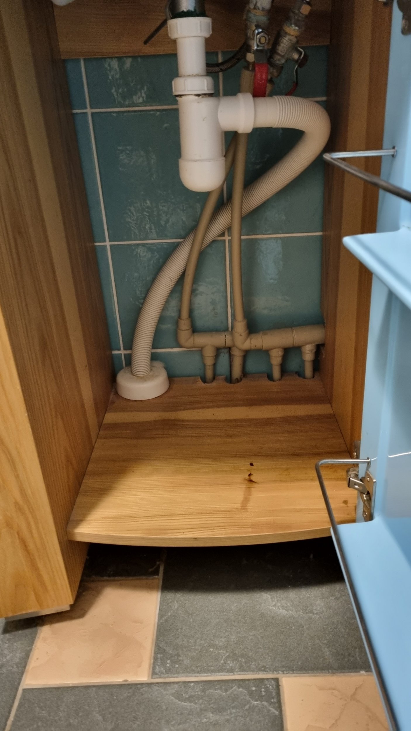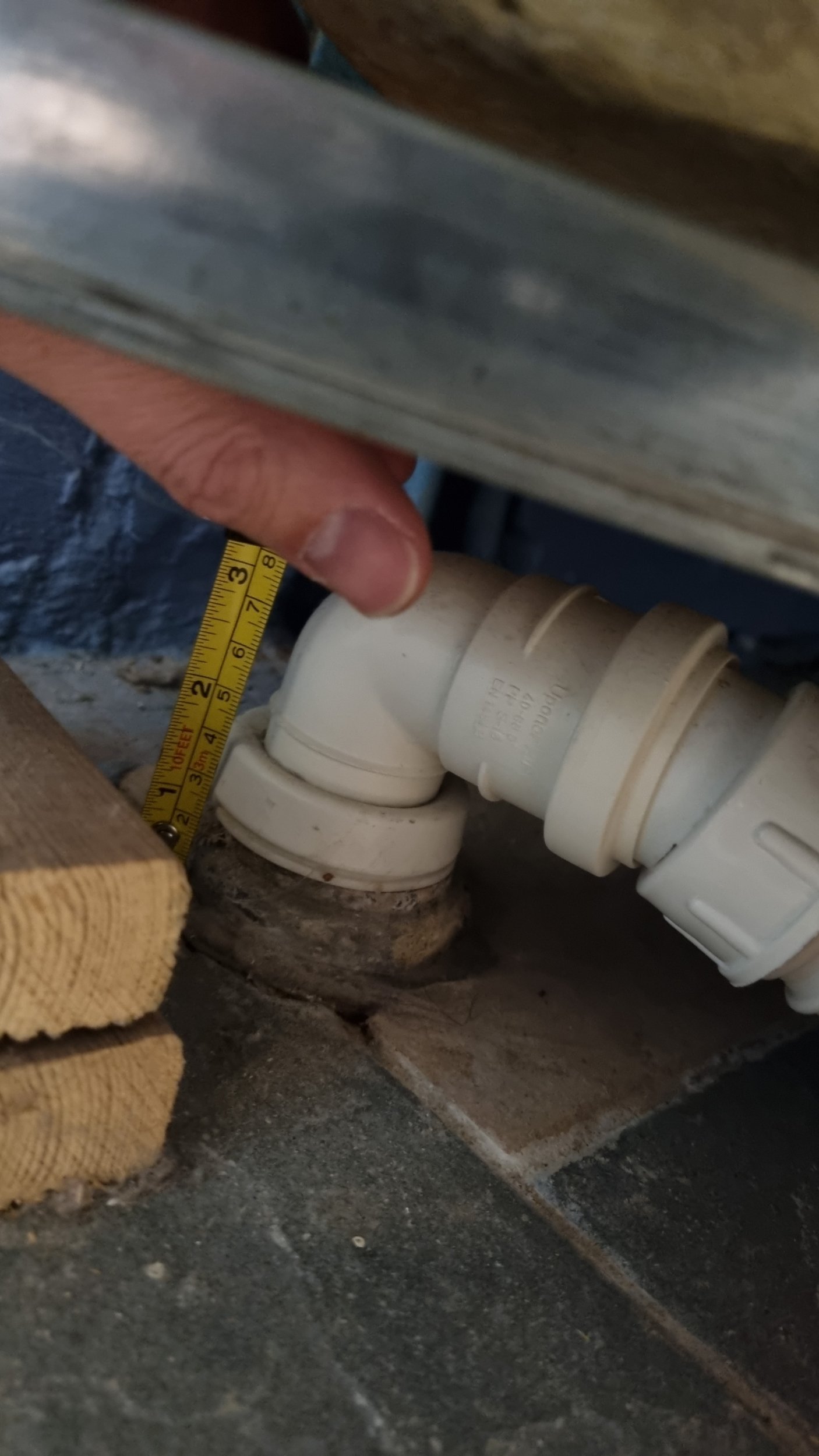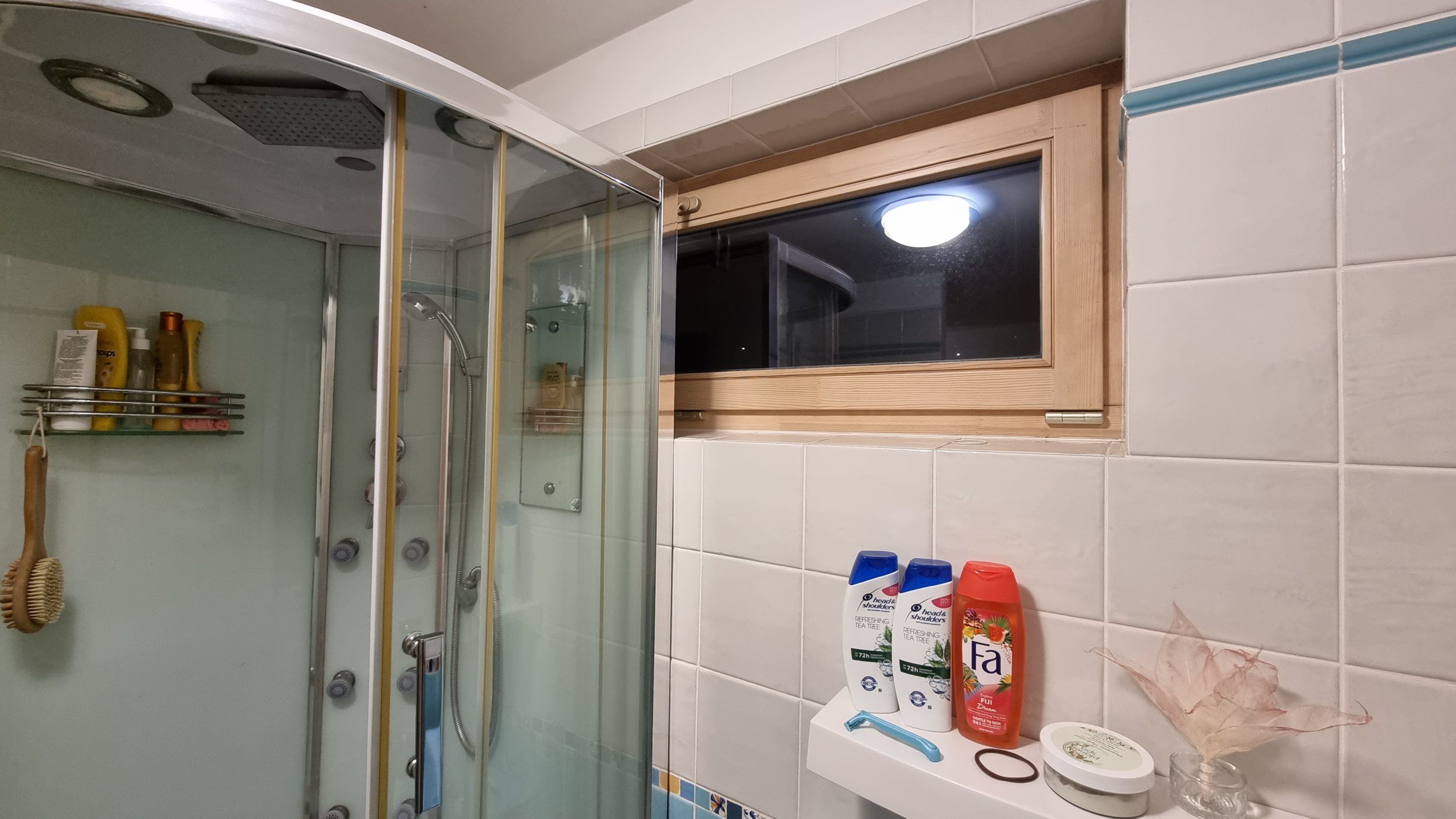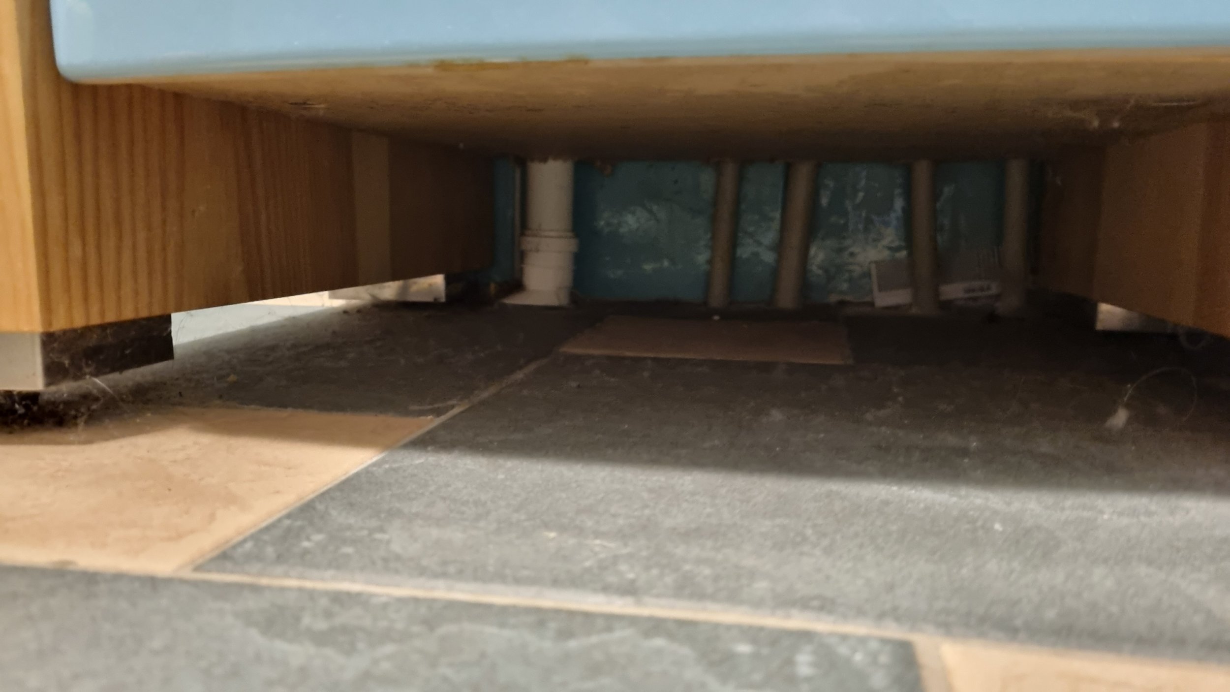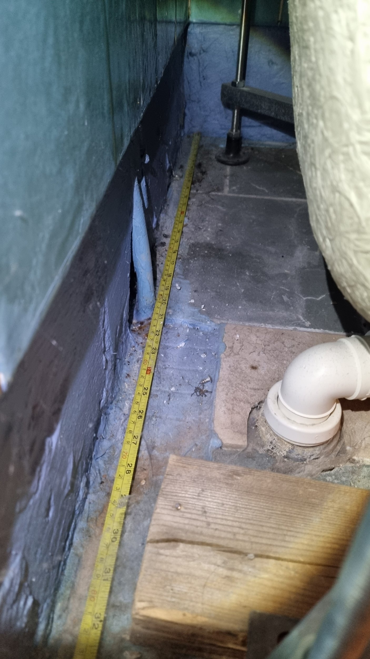 • Dušinurga all jooksevad kaks küttetoru, mis lähevad seina alt sauna. Paistab, et sauna sein on ehitatud pärast põranda valamist. Üks küttetoru jookseb 5 cm kauguselt äravoolutorust. Teine on juba märksa kaugemal.