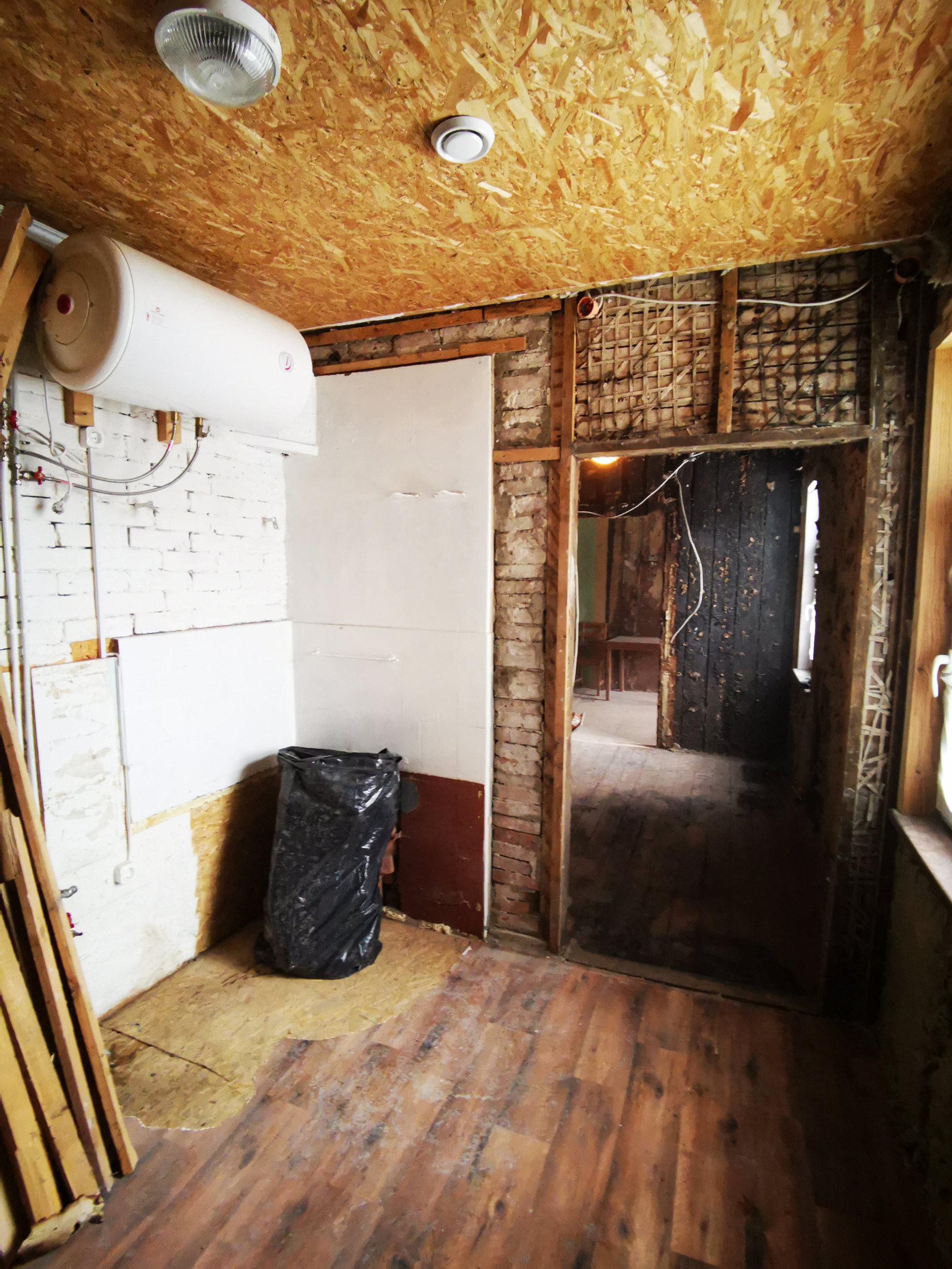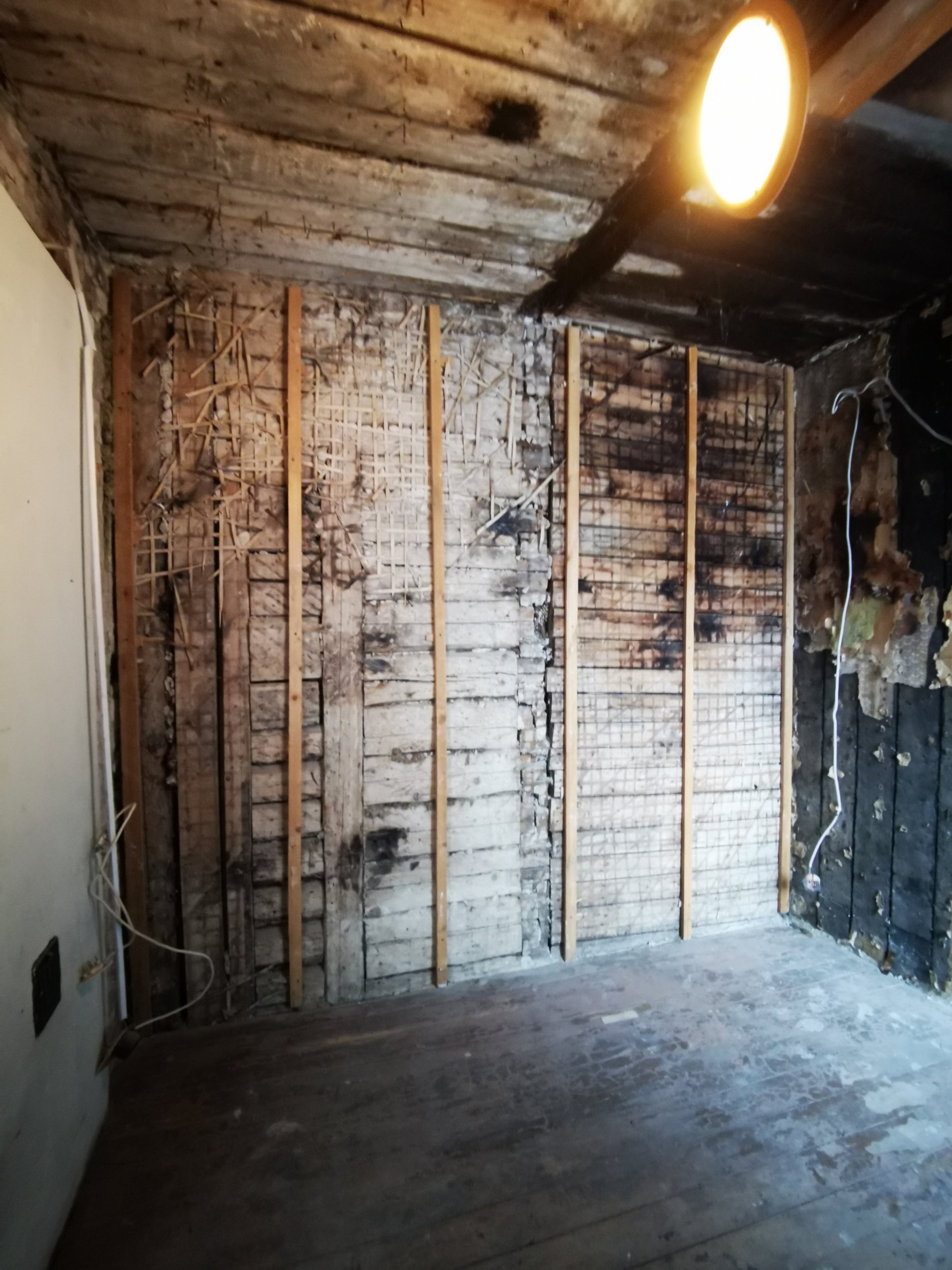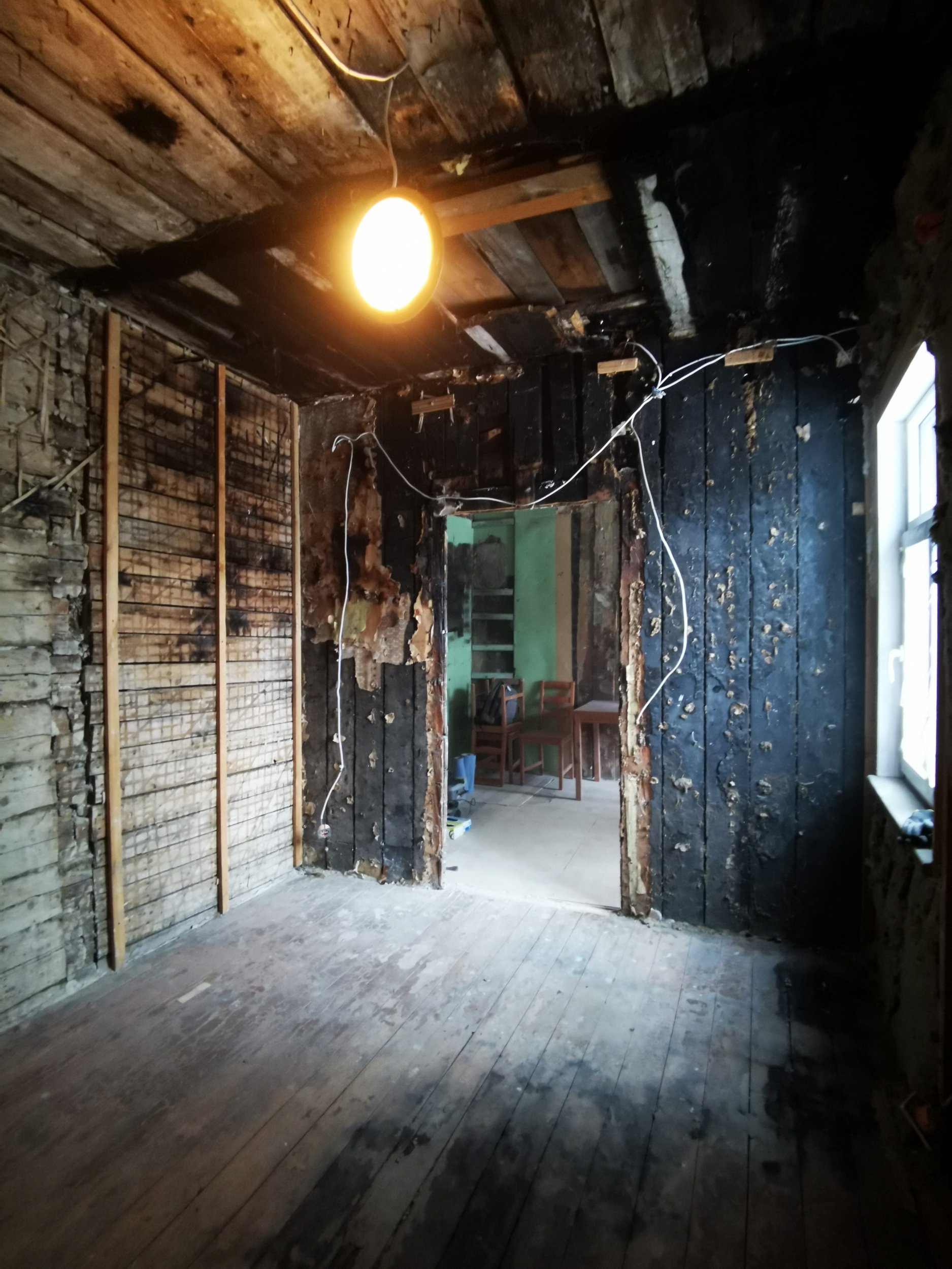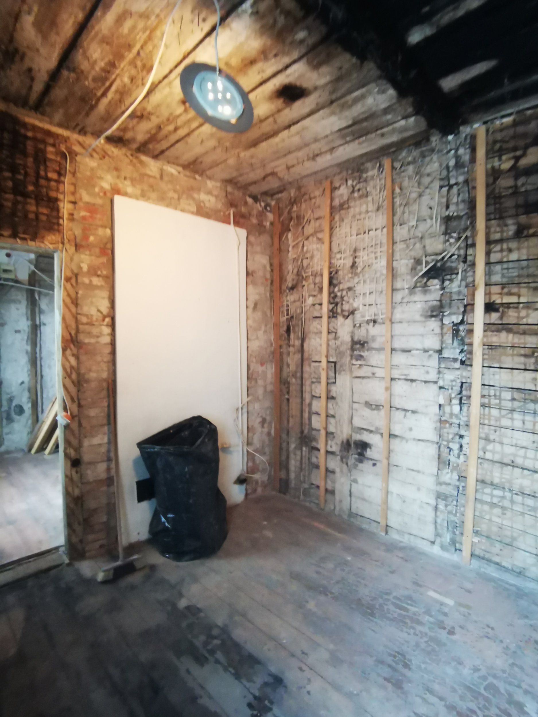 Lammutus üks vahesein/põlenud. Soojamüüri lammutus- elutoa-kõõgi alal.