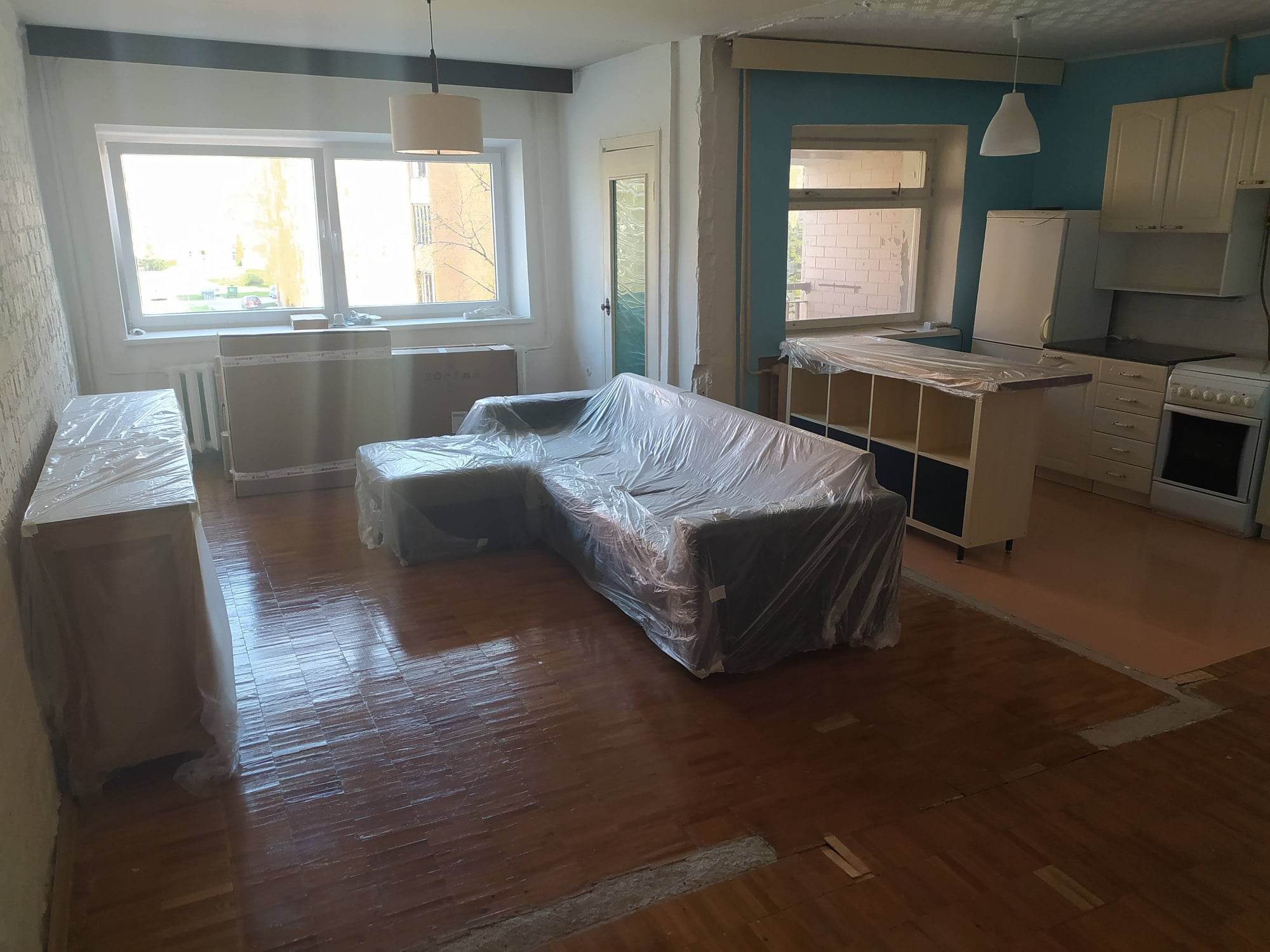 Korteris on eemaldatud mõned vaheseinad ning momendil nendes kohtades ebatasane. Korteris on mööblit, mida ei saa remondi ajaks välja viia (diivan, riidekapp, voodi, kummut jm) ning mida tuleks remondi ajal liigutada. Köögimööbel läheb enne ehitust välja.