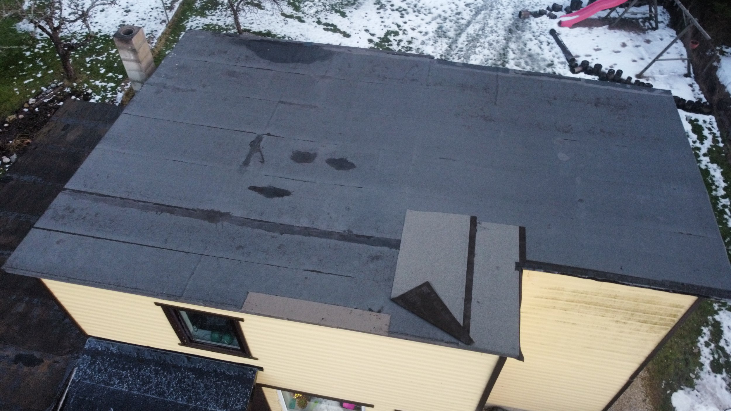 Katuse pealiskihti katab bituumen, mille all OSB plaat, roovitus ja prussid 50x150.