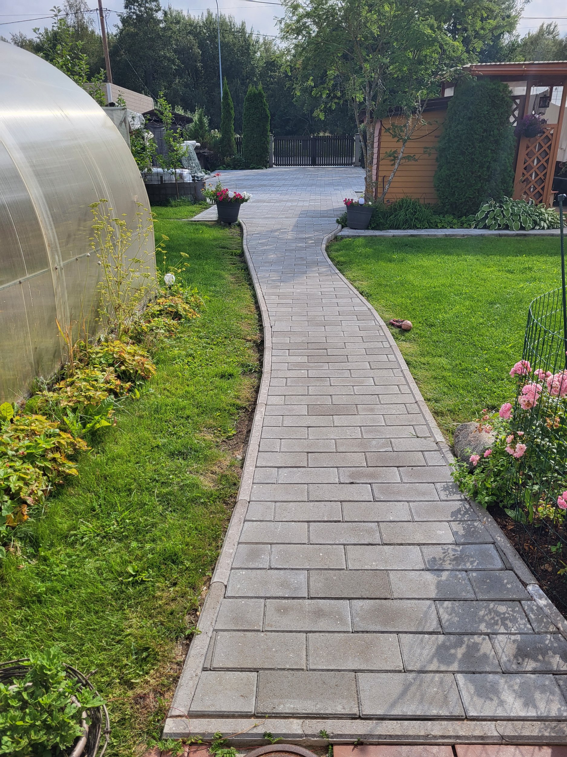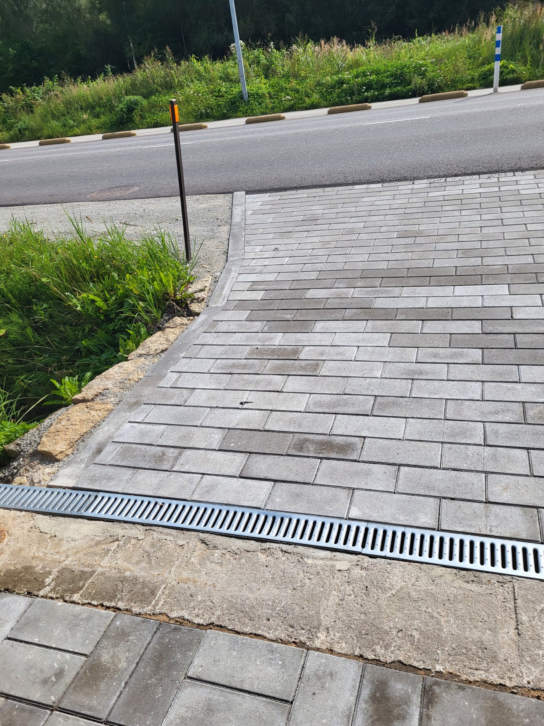 Pakutud halli kõnnitee äärekivi L=1000 ja kivisillutist H=60 mm. Kui olete nõus kaaluma sissesõidutee asfalteerimist ja kõnnitee rajamist graniitkillustikust, saame läbi rääkida sõnumi teel.