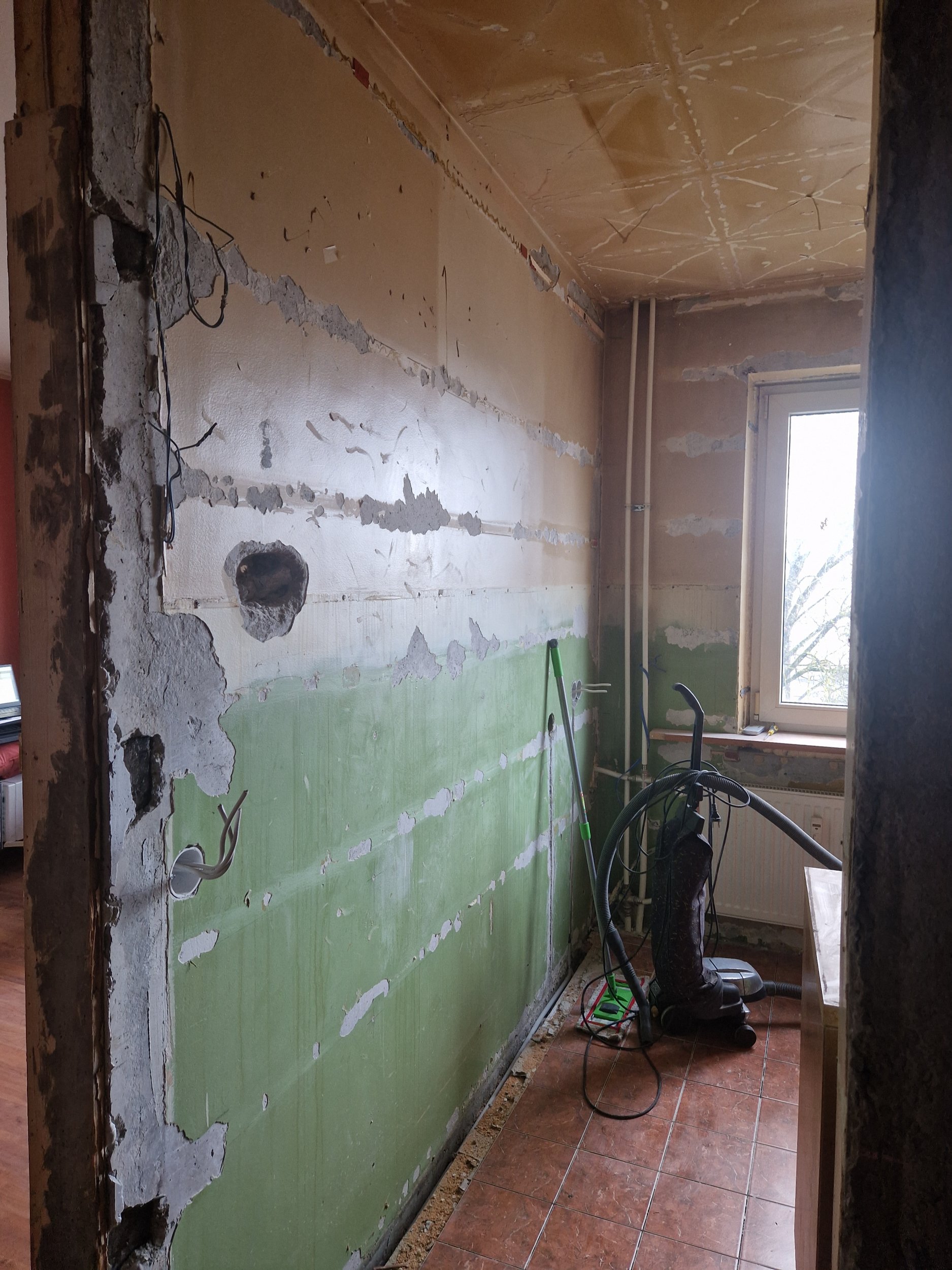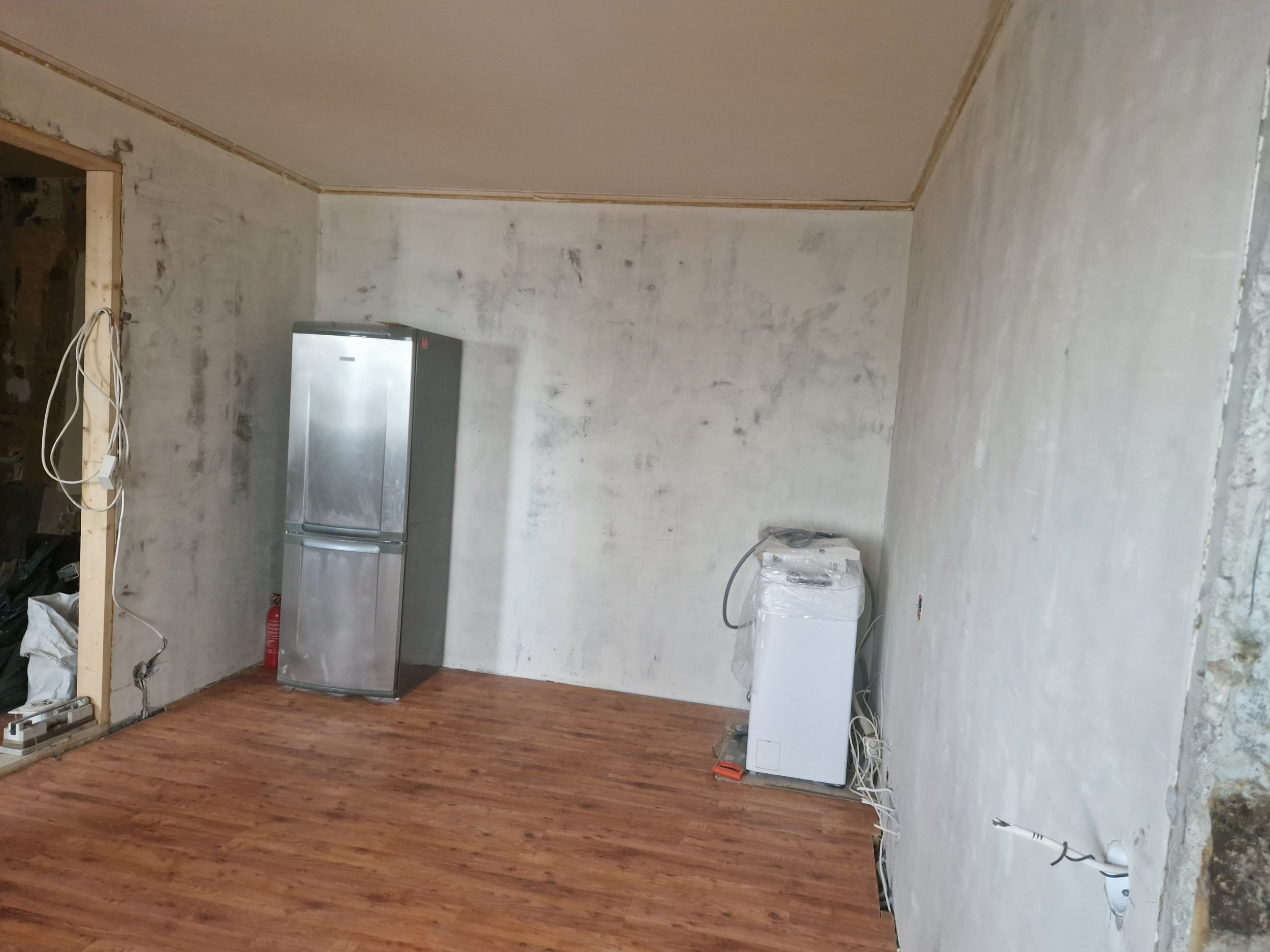 Köök: lahtine värv maha, nakkekrundiga üle (Betonkontakt), (kips)krohv ja pahtliga viimistlus. Lagi ja seinad.