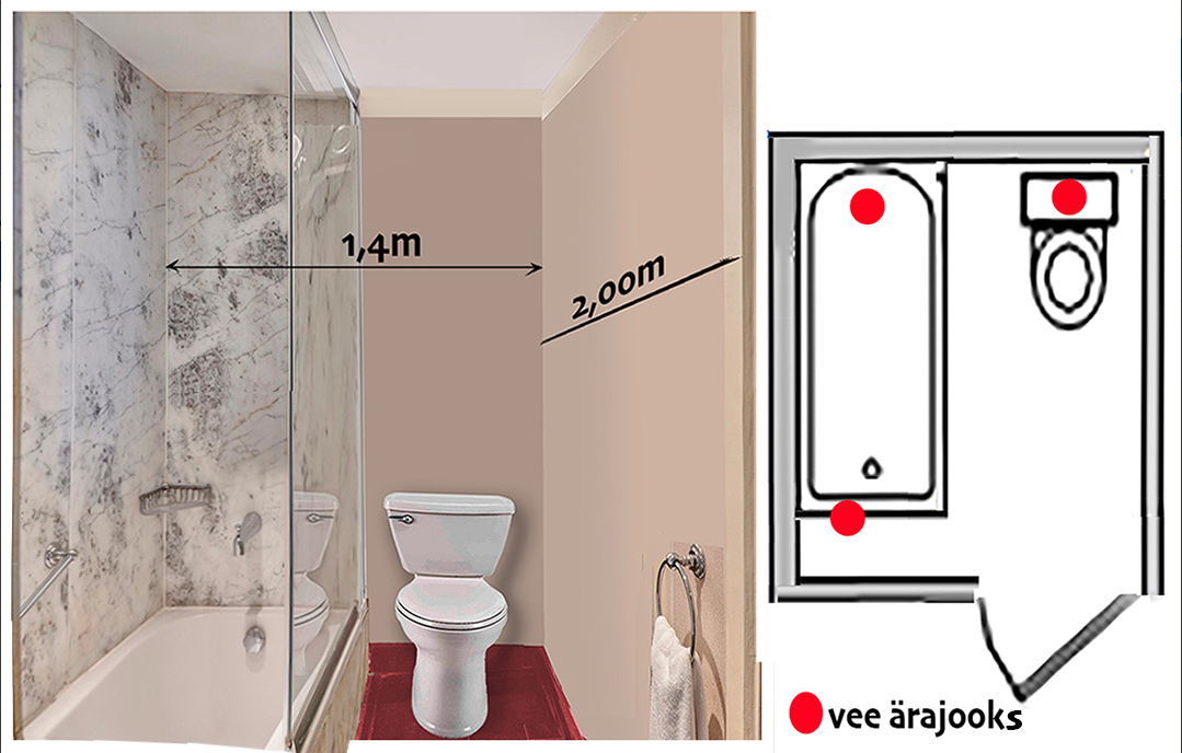 Duširuumi (2m x 1,38m) vanni paigutamine,(Vann on olemas) Ümber tuleb tõsta WC pott ( Uus pott olemas) ja dušikraan (dušikraan on olemas), Vastavalt joonisele ENNE ja PÄRAST. Kraanikaussi pole vaja. Pesumasinat ka mitte. Võimalik, et vee- ja äravoolu torustiku tuleb ümberpaigaldada.
