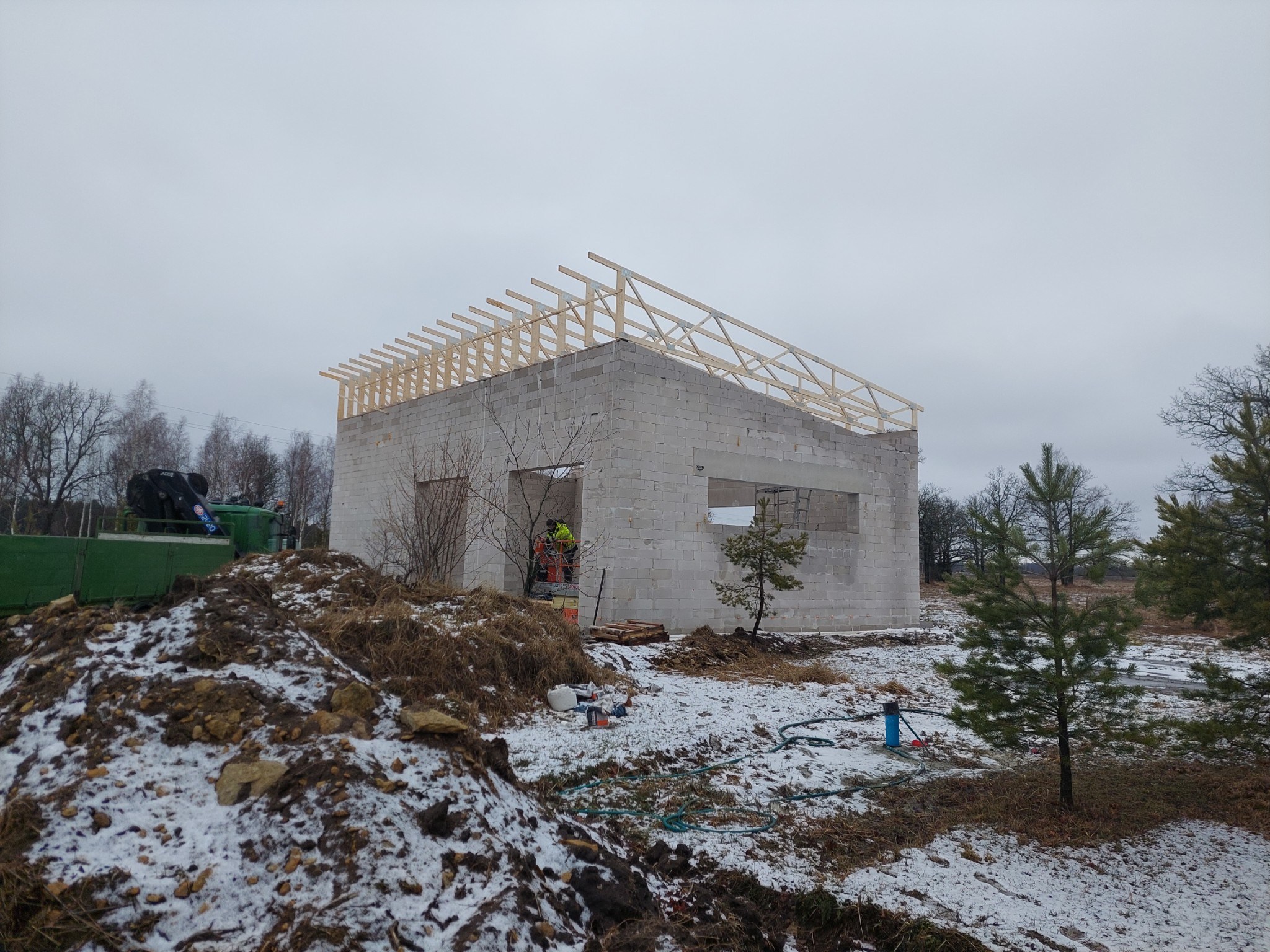 Fermid on katusele ära tõstetud lihtsalt , aga pole veel loodi aetud ja täpselt paika pandud. Kõik tuleb töö tegija poolt täpselt loodi ajada ja korrektselt kinnitada puidust vöö külge. Külgedele ja otstesse kinnitada 12mm osb. Katusekangas ja roov paigaldada ning kiviprofiilplekk. Lisaks vaja veel teha kinnised tuulekastid. Katuse pind 11.3x 16.6m