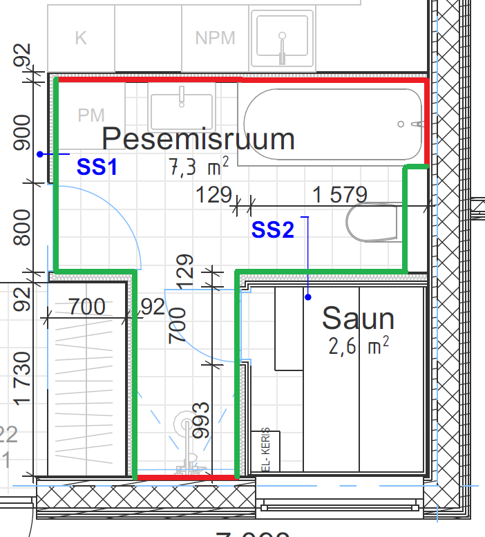 5) Seinte plaatimine (plaat 25x75): vannitoa seinad ~20m2, 3 välisnurgas lõigata plaadid 45 kraadise nurga alla, ühes seinas on seinapealne WC pott, kahes seinas uksed (vannitoa uks ja sauna uks). Plaaditavad seinad märgitud joonisel rohelise joonega. Selle plaadi mõõdud võivad veel muutuda, valime hetkel 40x60 ja 60x60 vahel.
