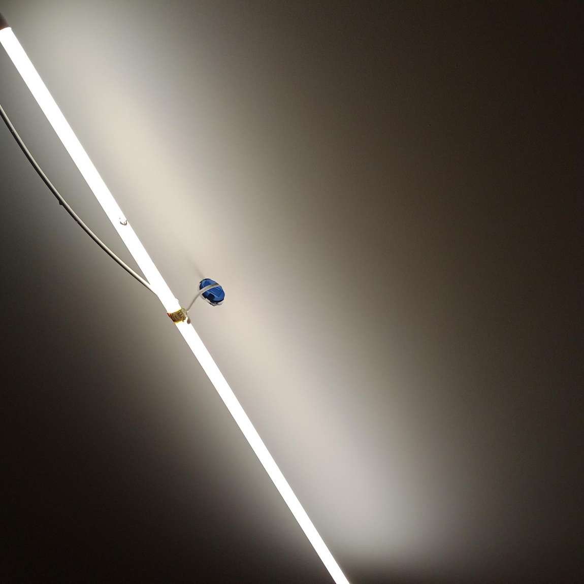 Riputage 6 valgustit vannituppa vastavalt niiske ruumi reeglitele. Praegu pole rippuvat ülemmäära. Seetõttu keerake konksud lakke, riputage lampid selle külge (see on ajutine kinnitus).