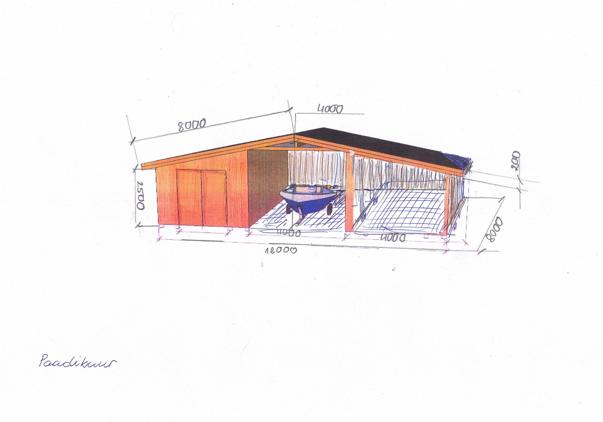 Vaja teostada paadikuurile projekt mõõtudega 12x8m. Postvundamendile. Puitkarkass.viilkatusega.