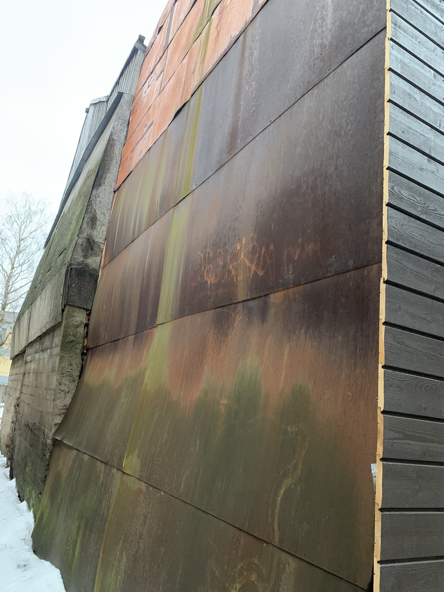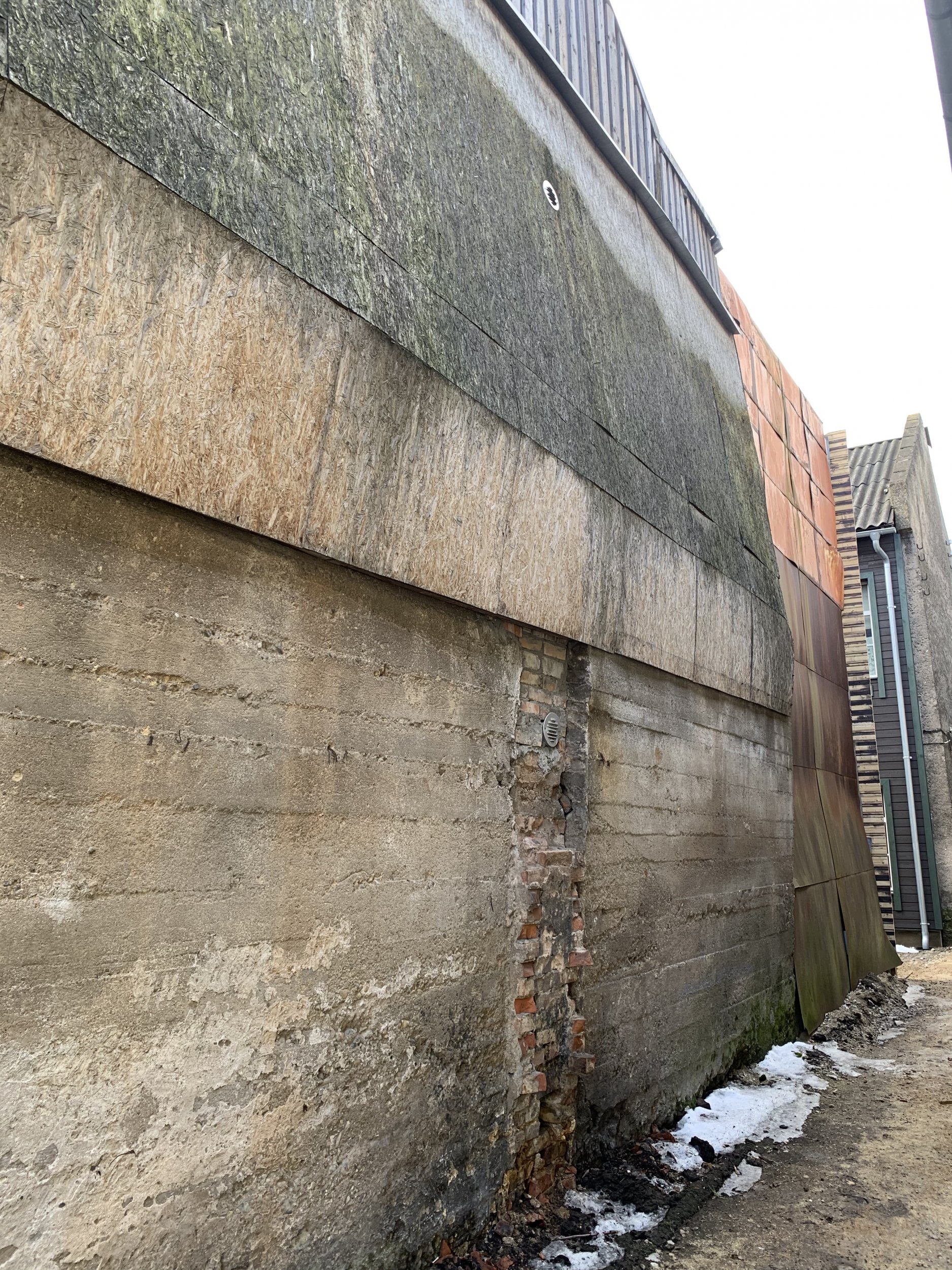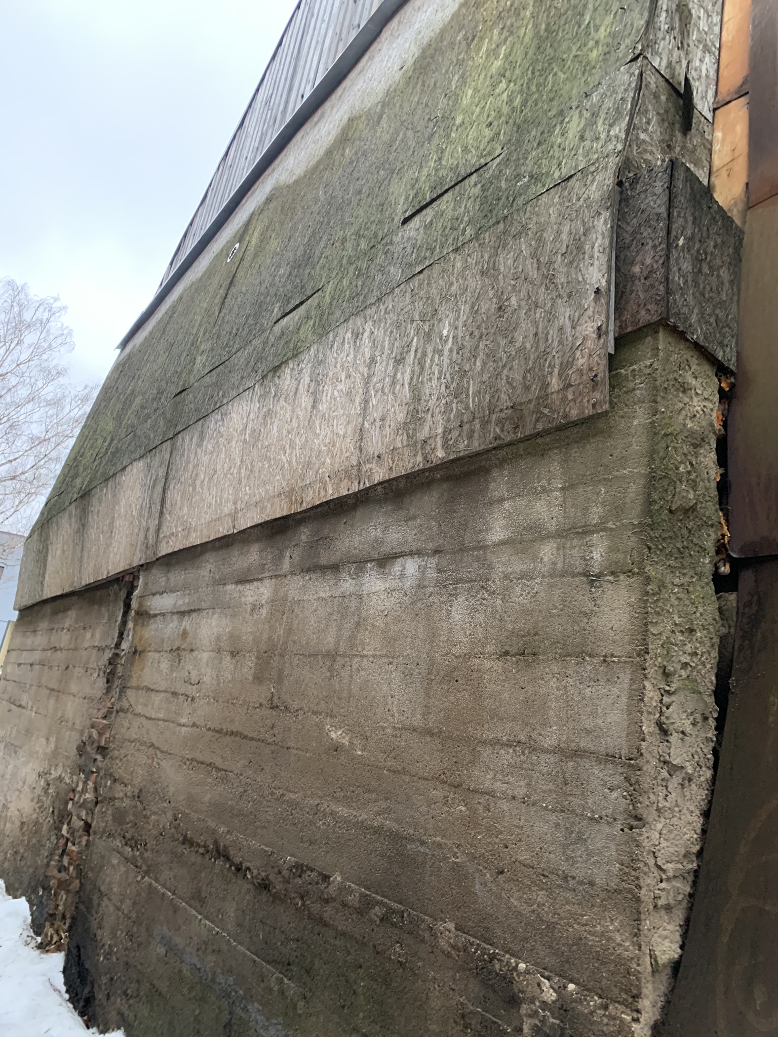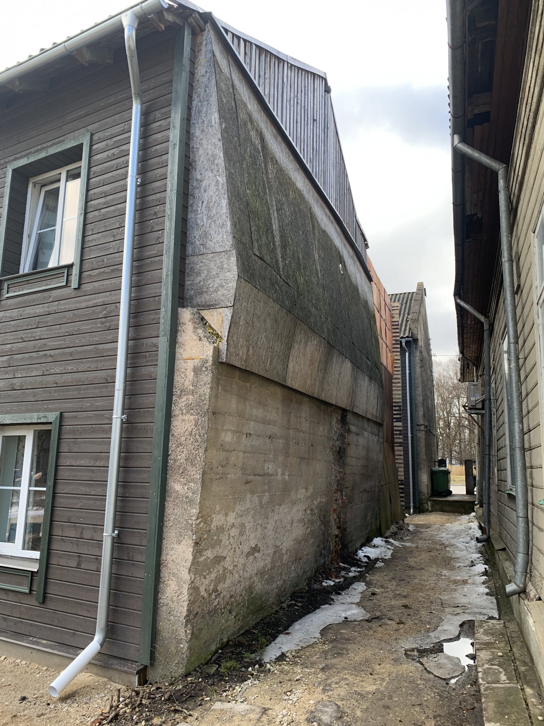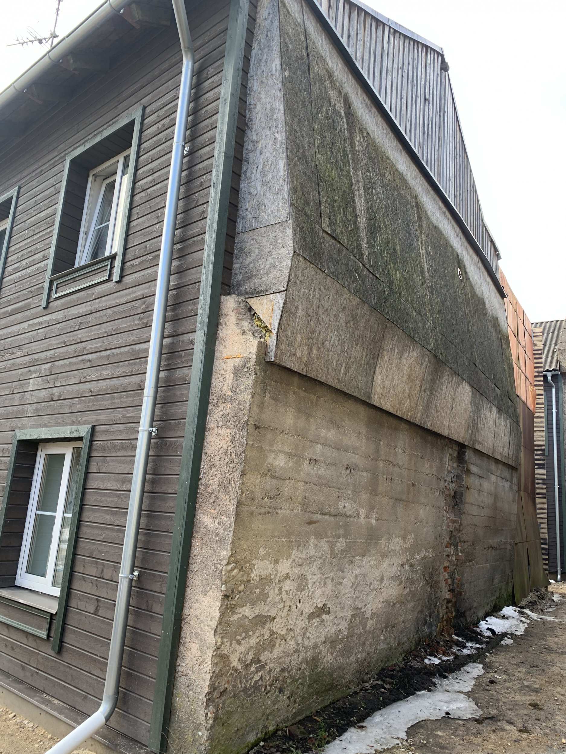 Otsaseina Betoonosa on kõver, vajunud, betoonosa toestamine edasi vajunise kindlustamiseks.