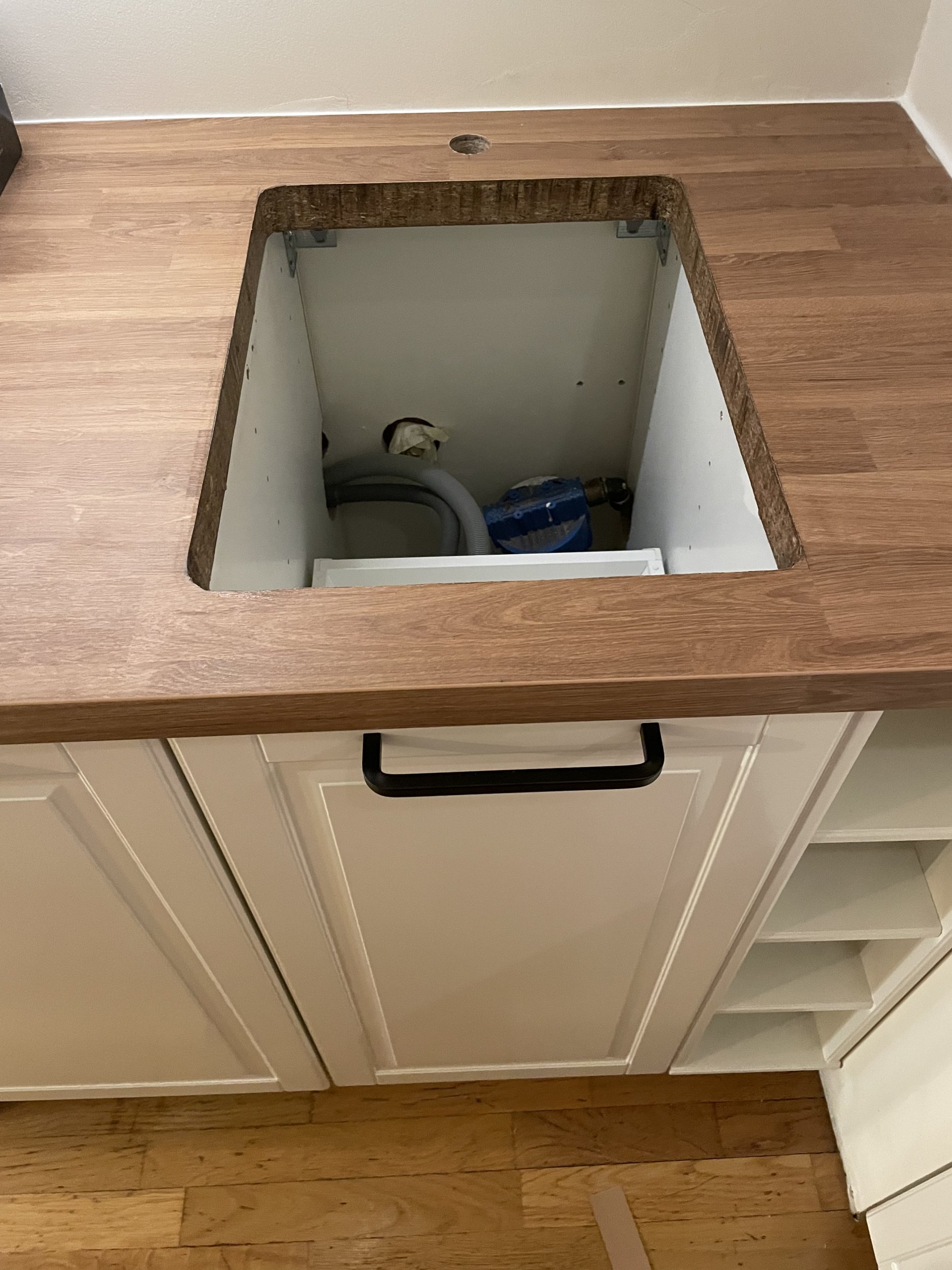 Tööpinnapealse valamu paigaldus töötasapinnale (auk selleks lõigatud). Segisti paigaldus (auk selleks lõigatud). Valamu ja nõudepesumasina torude ühendamine.