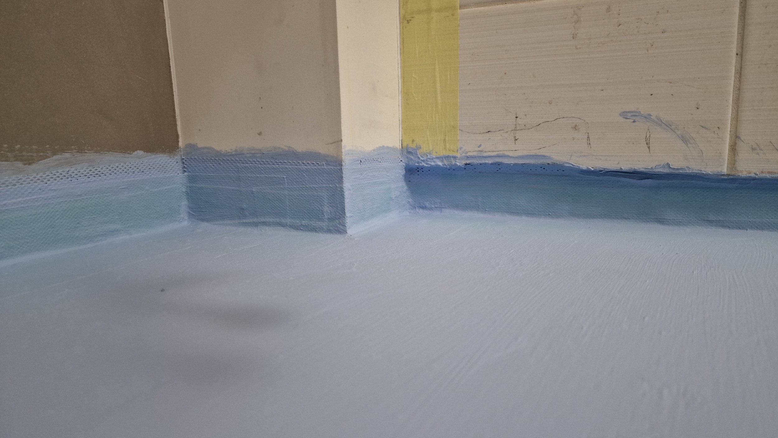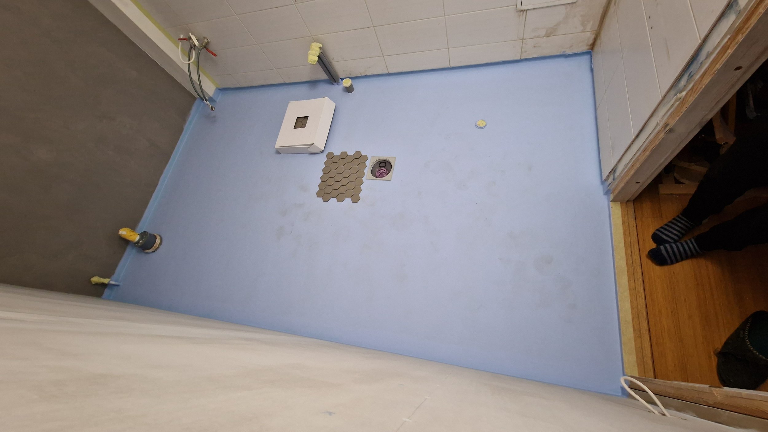 Ühe nüansina on vaja kahes seinas oleval valgel plaadil saagida alumine serv ära 3,6m pikkuselt sellisel kõrgusel, et sinna alla mahuks vertikaalsed plaadid paigaldada. See tähendaks seal ka hüdro peale kandmist mis mul olemas. Ise pole söandanud saagida kuna pole lõplikult kindel millise kõrgusega põrandaplaadid lõpuks jäävad.