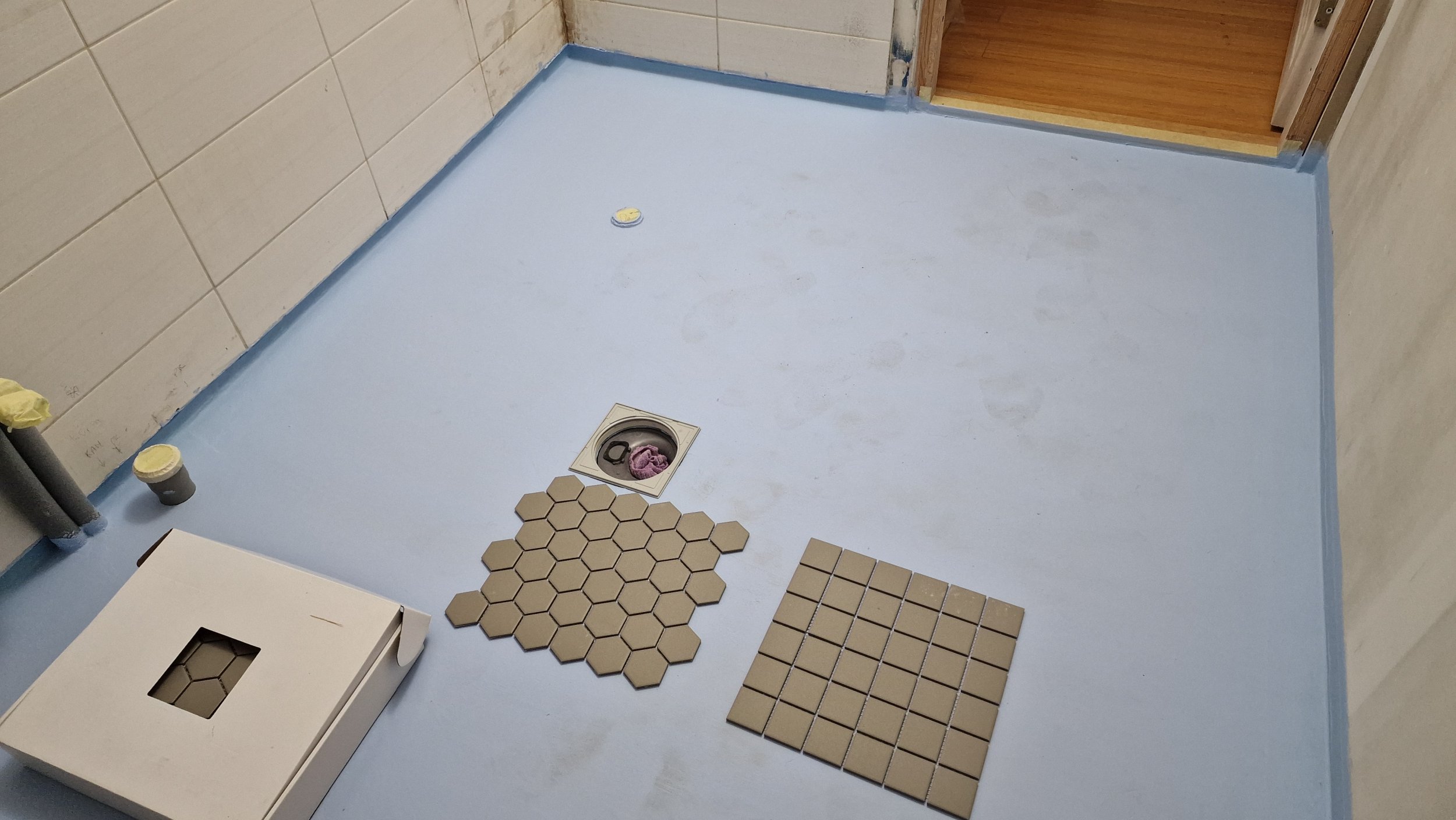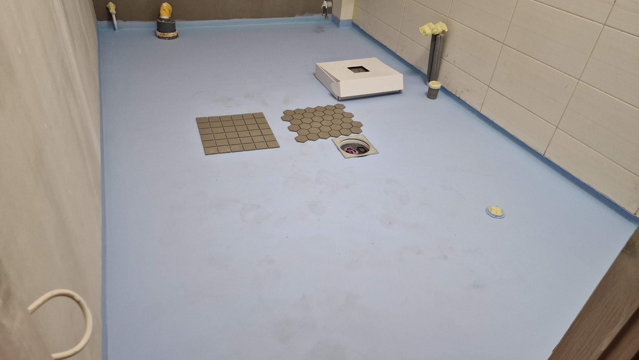 Vaja plaatida kuusnurksete võrgul olevate u 5cm laiuste ja 5mm paksuste plaatidega duširuumi põrand ning neljakandiliste 5cm laiuste plaatidega üks vertikaalne rida seinale. Aluspõrandale on kalded antud ja hüdroisolatsioon tehtud. Ruumi mõõtmed 1,7x2,8m.