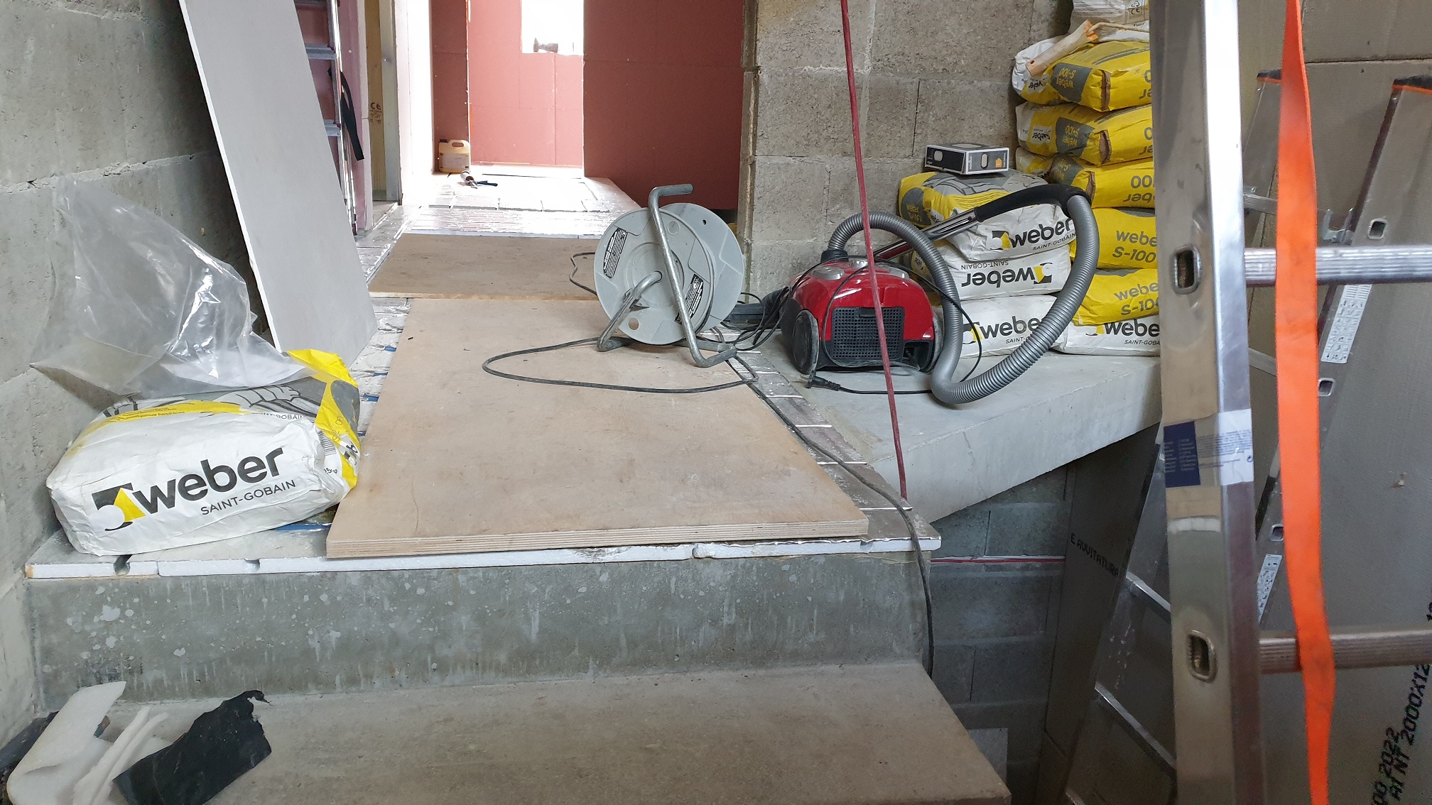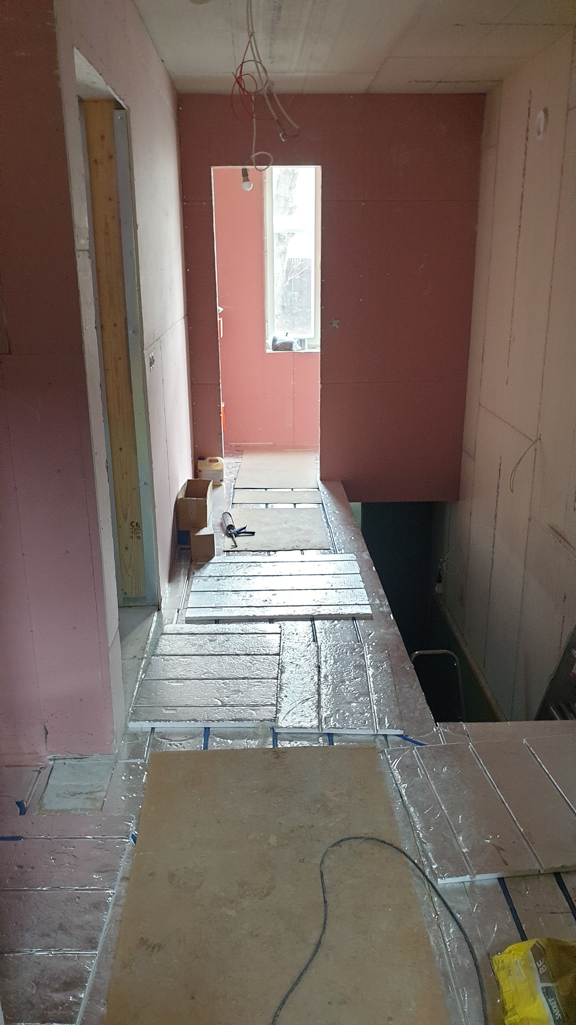 Hüdro tsirka 6m2 (wc ilma dušsita, kus põrand kuni akna ääreni hüdroga), põranda plaatimine floorele tsirka 12m2. Plaadid on wc-s ja koridoris 60x60cm ning ukseesisel platvormil (1,5mx2m) 1200x600mm. Platvormil vaja täita ~1m2 floore (17mm) kõrguseni.