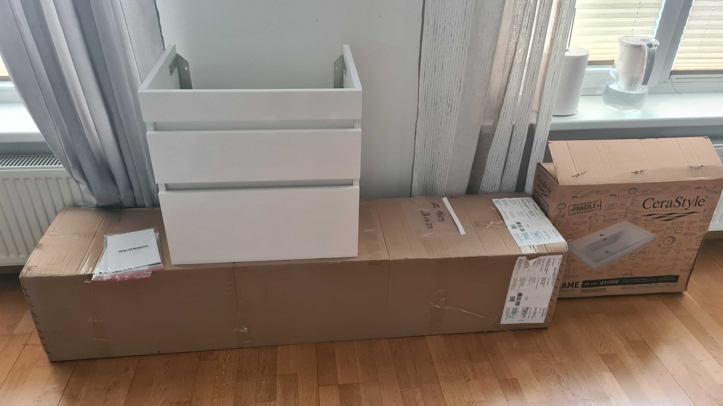 Pakkumine sisaldab kraanikausi eemaldamist, uue kraanikausi paigaldust, kraani ühendust vee ja äravoolusüsteemiga, seinakapi ja LED valgusti paigaldust. Eeemaldatud kraanikausi ja peegli utiliseerimist. Garantii töödele 2 aastat.