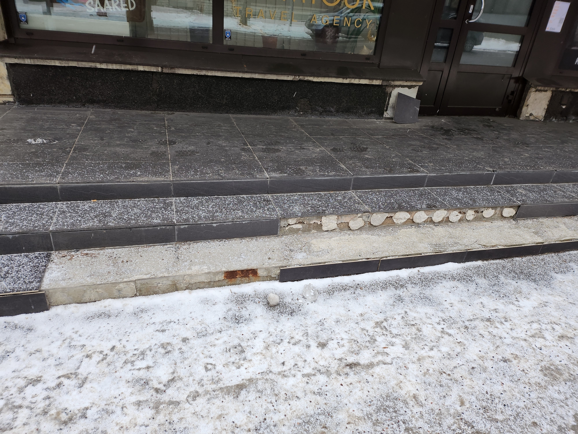 Kuna välisukse raam on hetkel üsna täpselt trepi pinnaga tasa ( olemasoleva plaadipinna ja välisukse vahel on hetkel ca 10 mm liikumisruumi) , siis tundub, et selleks , et ei peaks tervet treppi maha lõhkuma, on mõistlik paigaldada 10 mm plaadid. Hetkel on plaadid paigaldatud pätside otsa, kuhu vahele pääseb vesi ja talvel on see külmudes plaadid lahti murdnud. Seega eeldame korrektse tasapinnalise aluspinna ettevalmistust ja plaatimist.
