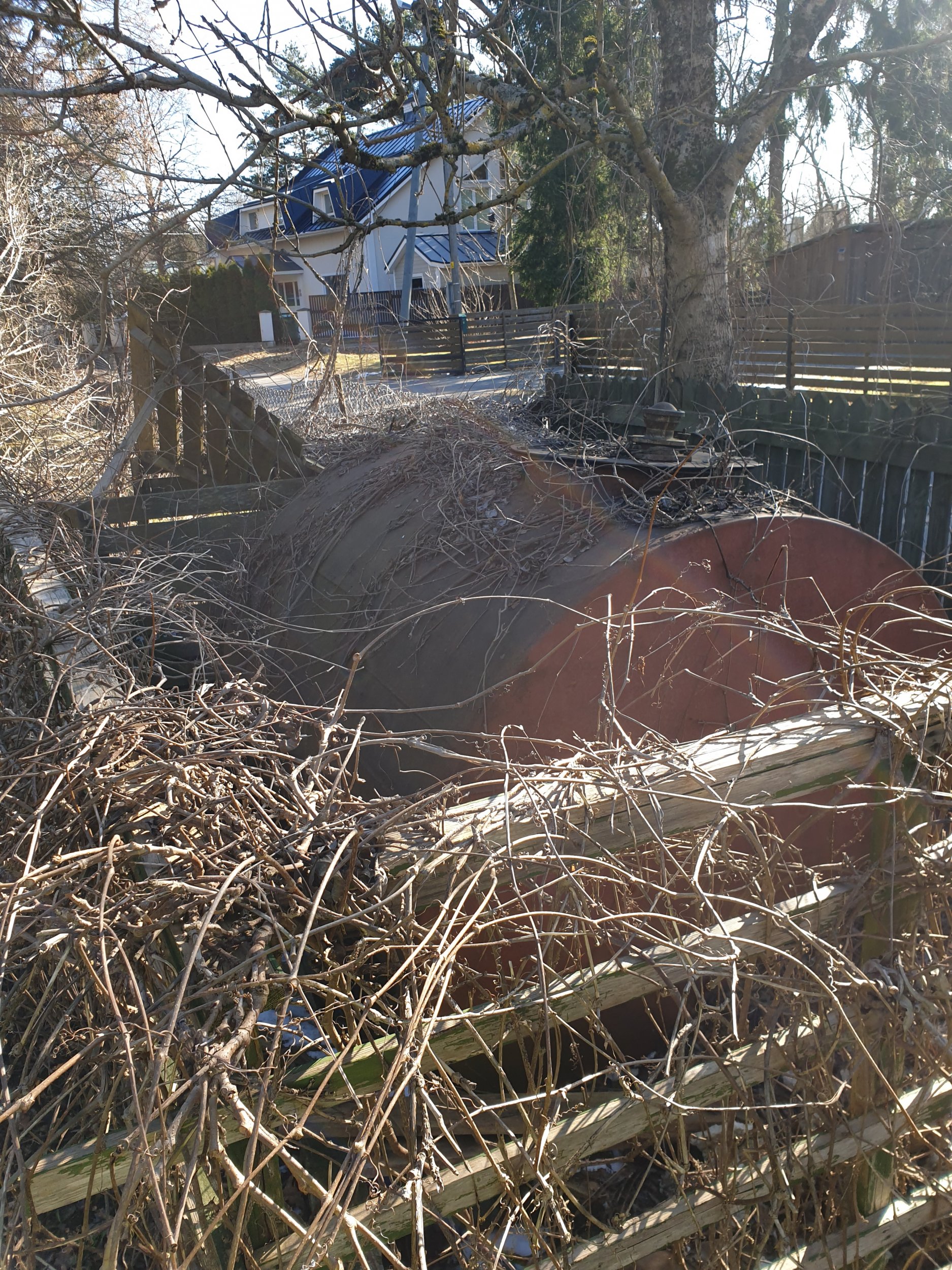 Tarvis Nõmmel eemaldada aiast vana kütteõli mahuti. Diameeter 1.5m pikkus 2m. Mahuti on aia kõrval ja tee läheb tagant mööda. Mahuti on tühi aga põhjas väike jääde mida ei ole saanud välja pumbata. Hea oleks üle aia tõsta kuid puud on veidi ees, saab ka teiselt poolt (aiast) tõsta kui teisiti ei saa.