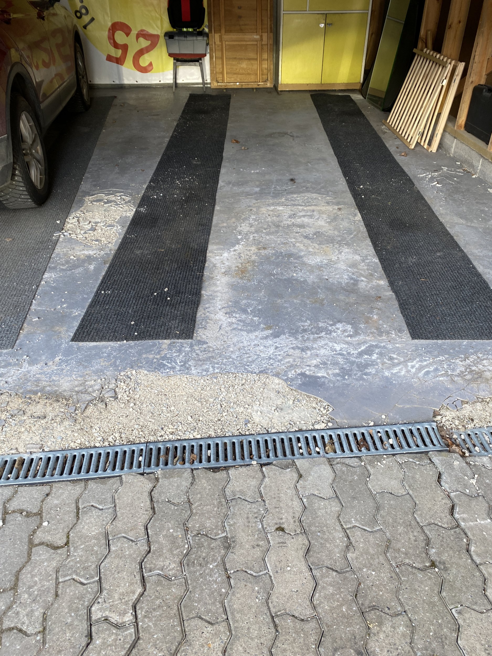 Garaaži põrand on valmistatud ebakvaliteetsest materjalist ja laguneb. Vaja on vana betoon välja lõhkuda, ära vedada ja valada uus põrand.