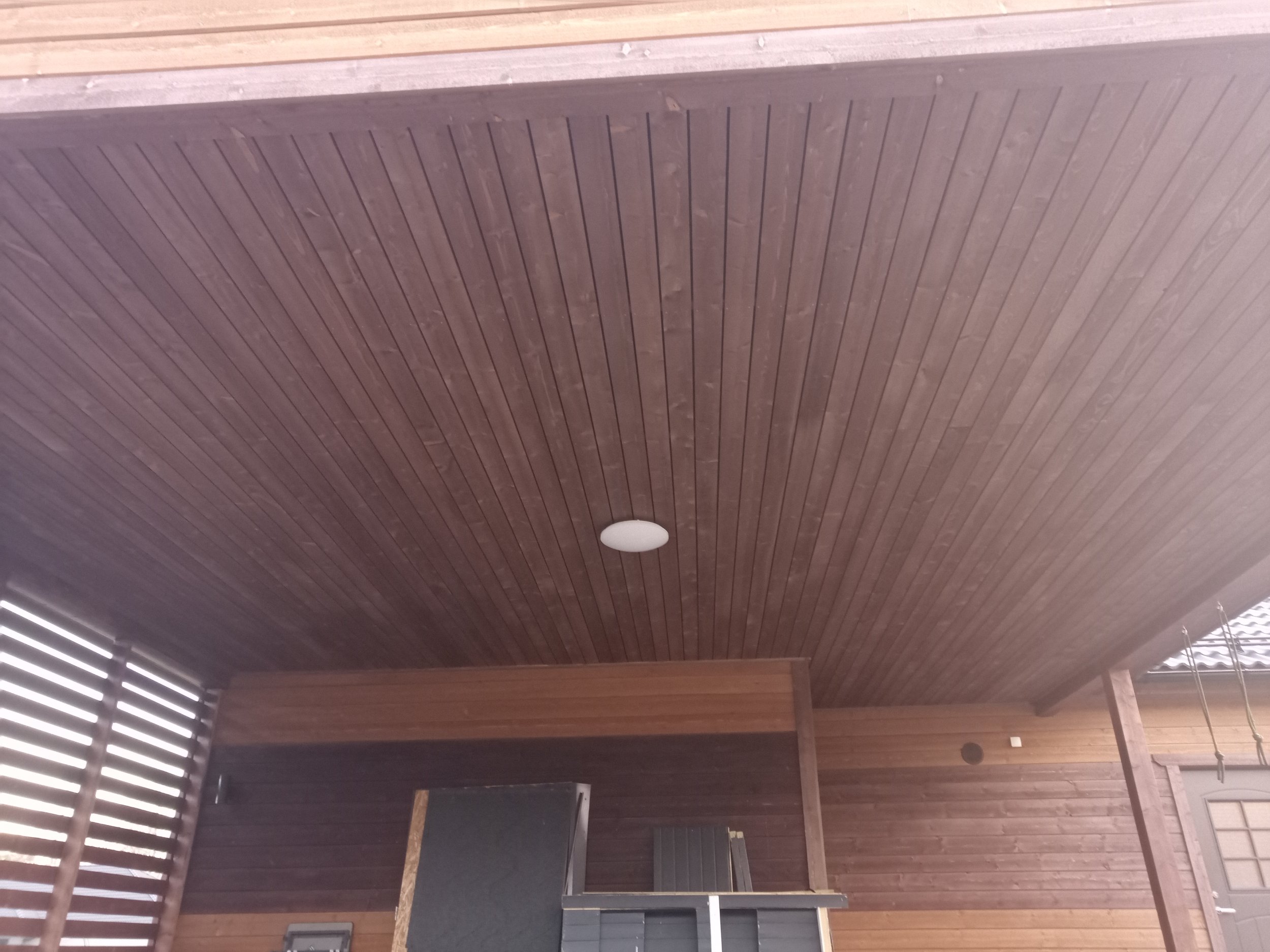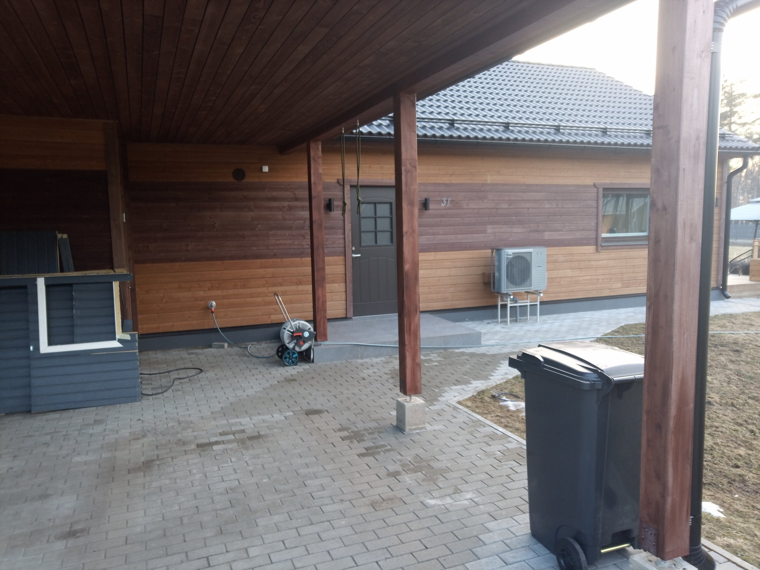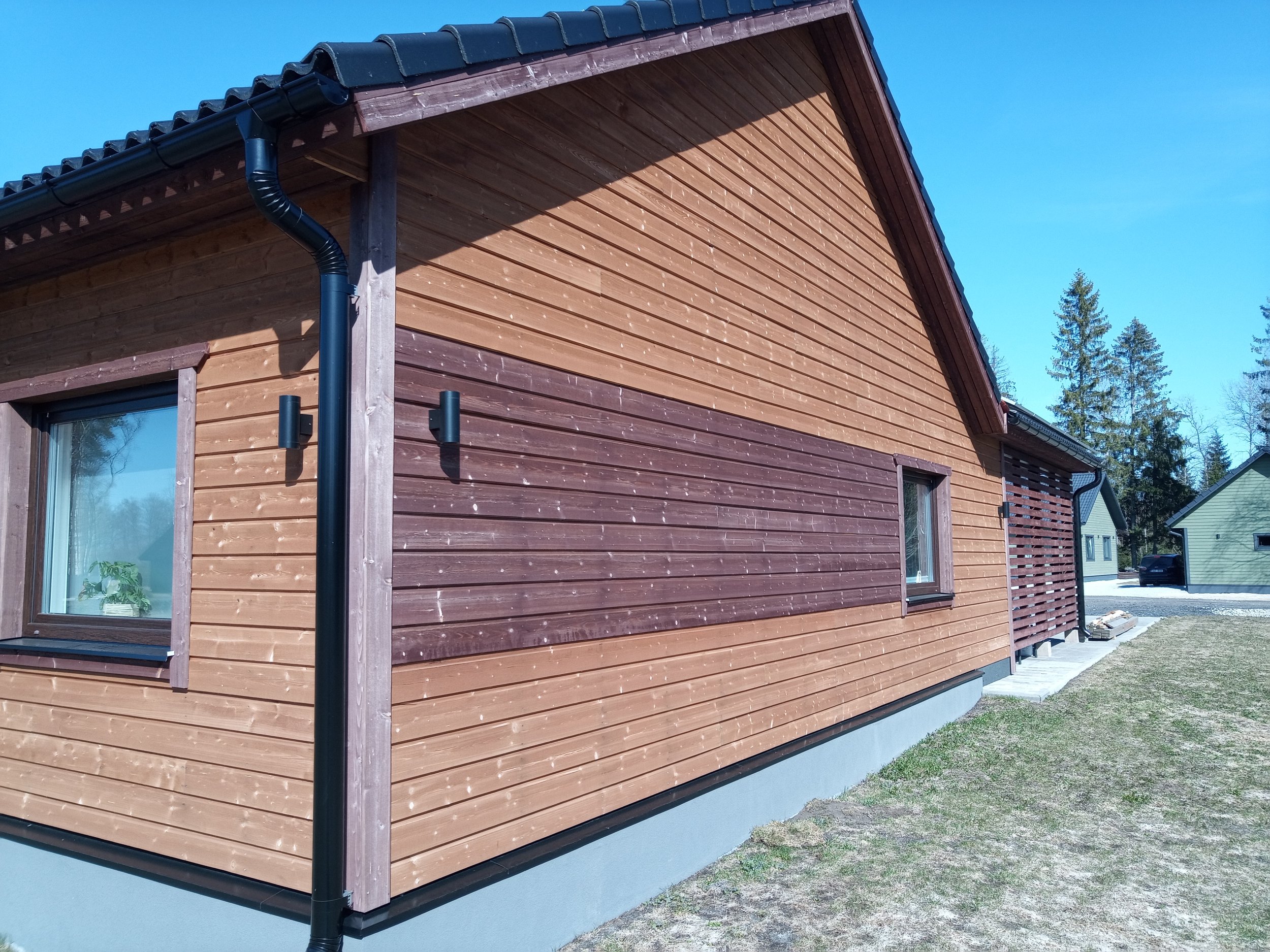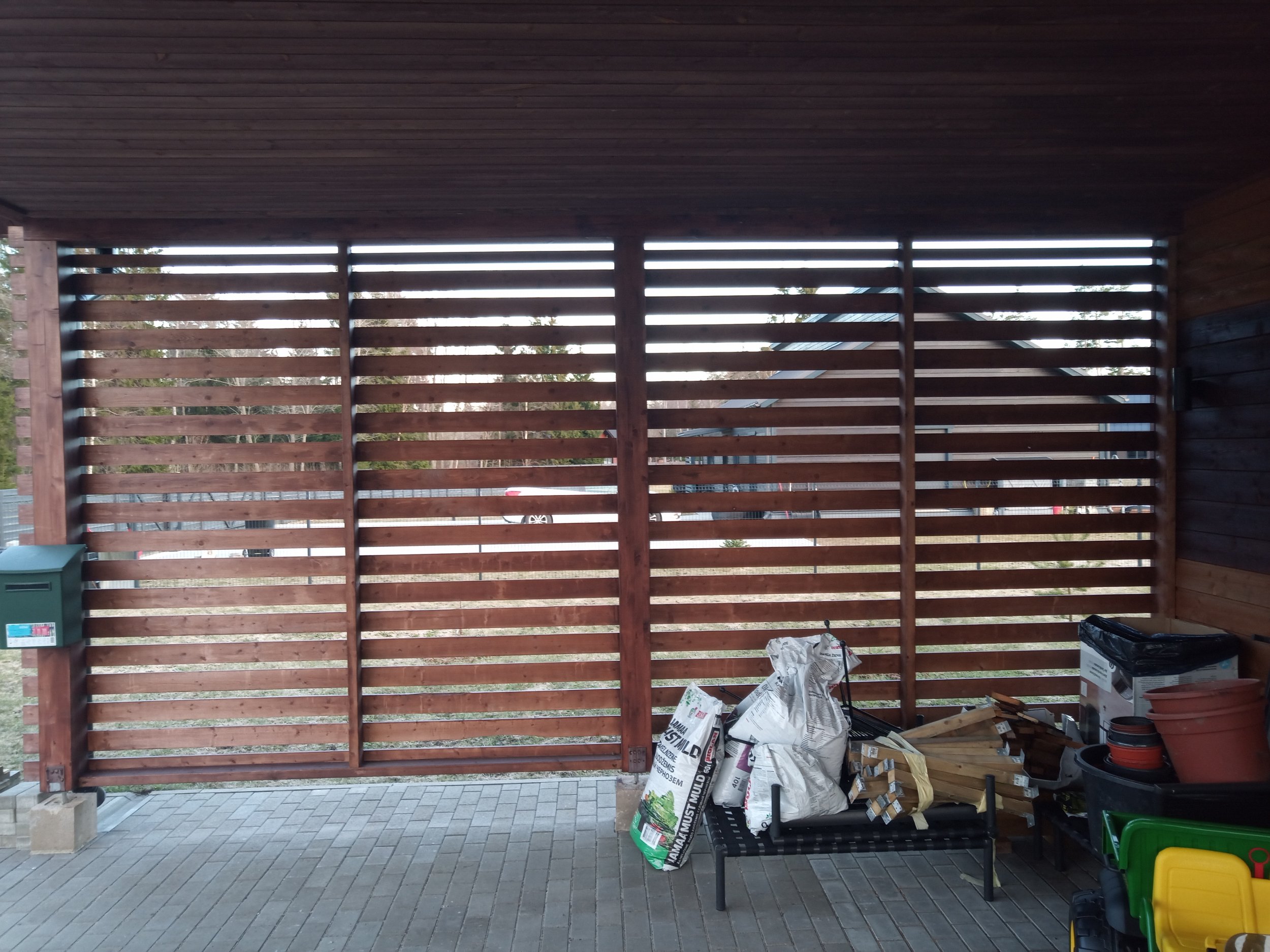 Laudisel on peal tehasest üks peits, maja saab intensiivselt päikest. Uus värvikihi tüüp peaks taluma seda pikalt. Värvitavat seina pinda on 187.51 m2, auto katusealune lae pind 43.31 m2 ja autoaluse külje aiaosa+postid 31.56 m2
