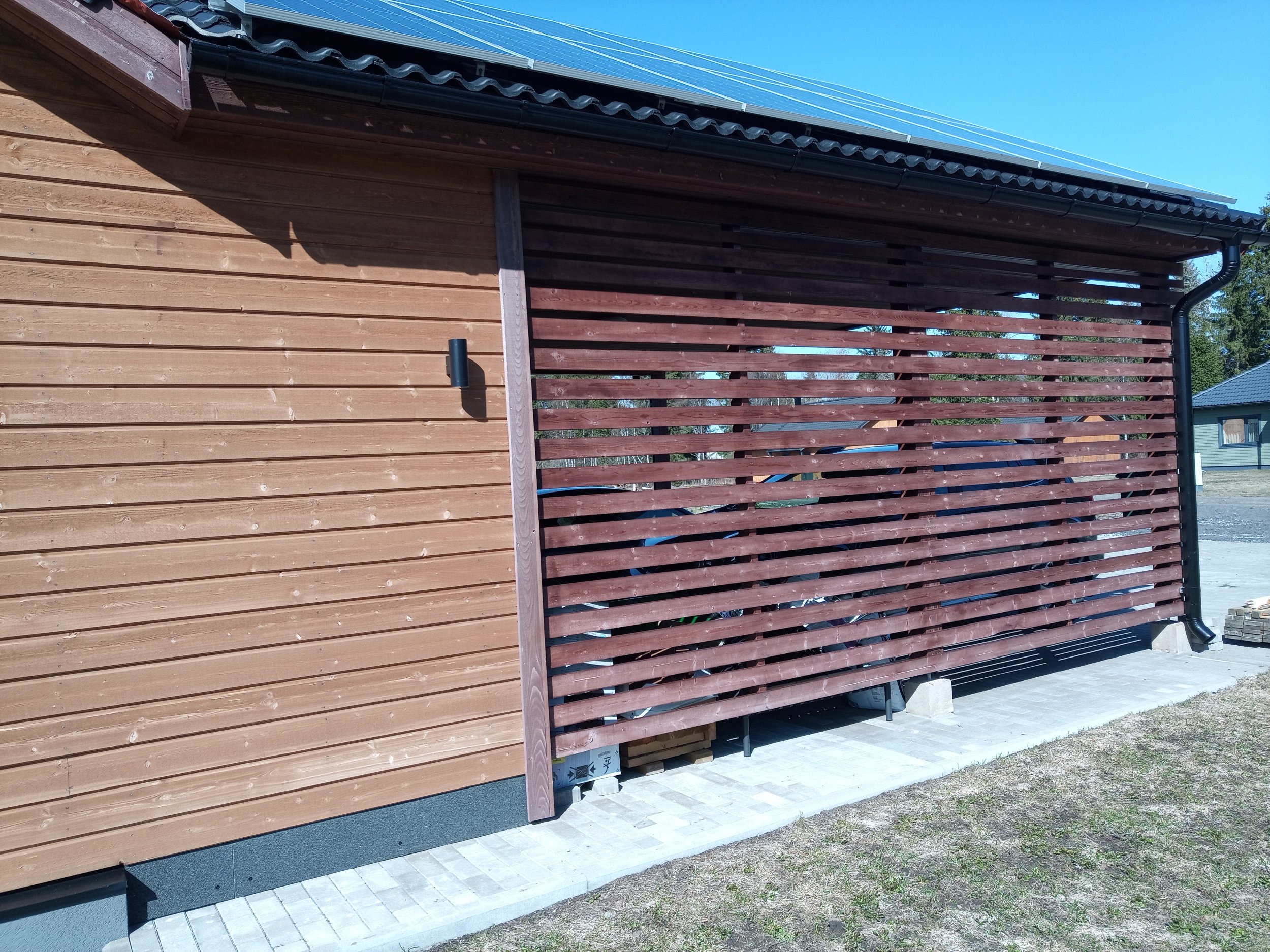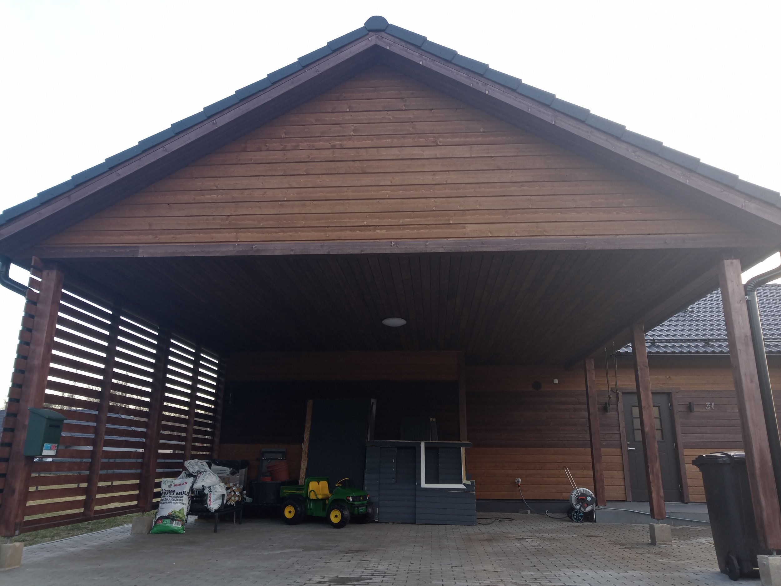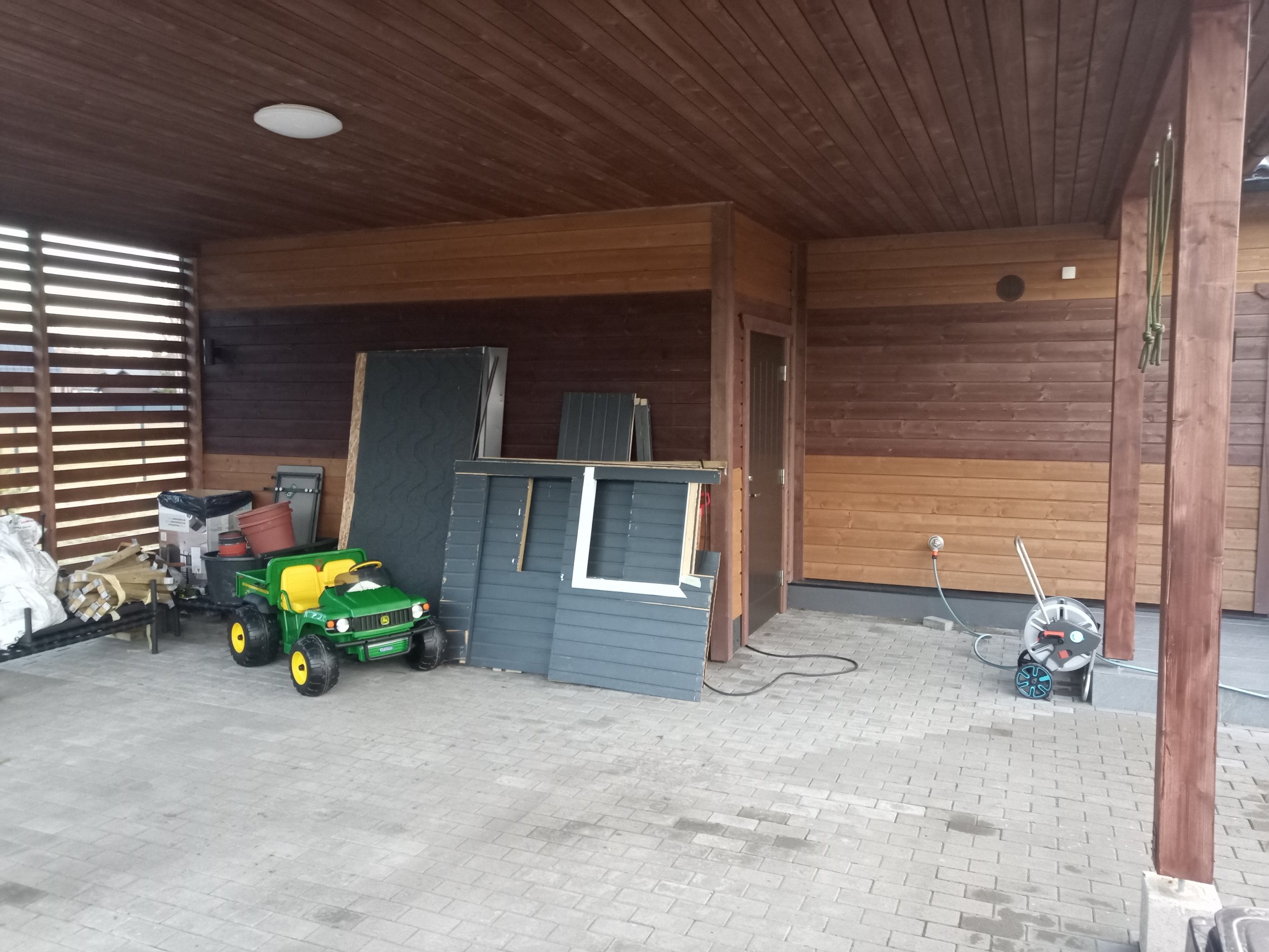 Laudisel on peal tehasest üks peits, maja saab intensiivselt päikest. Uus värvikihi tüüp peaks taluma seda pikalt. Värvitavat seina pinda on 187.51 m2, auto katusealune lae pind 43.31 m2 ja autoaluse külje aiaosa+postid 31.56 m2