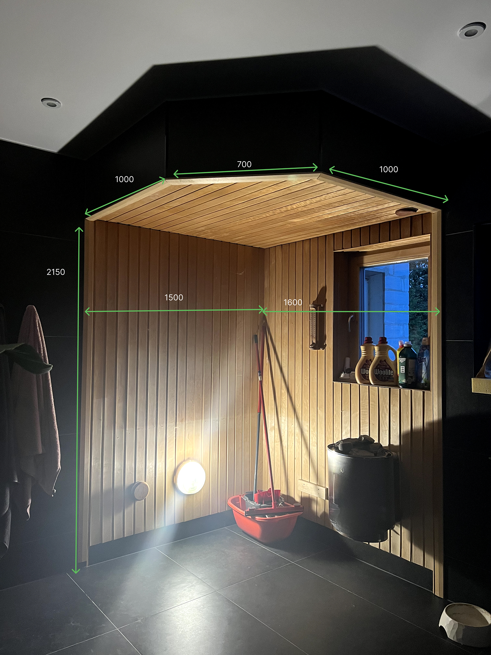 Remondi käigus eemaldati lava ning klaasid. Sooviksime vahetada voodrilauad uute vastu (link all) ning ühtlasi oleks vaja samas toonis lava. Tõenäoliselt selgub veel tegijaga koostöös igasugu muid detaile nt liistud ja aknaraam (ka hetkel vanas toonis), kerise mooduli vedamine/paigaldamine, lava täpne kuju ja valgustus jms. Kaasas olev sauna joonis ei ole kindlasti millimeetritäpsusega, lihtsalt umbkaudseks selgituseks.