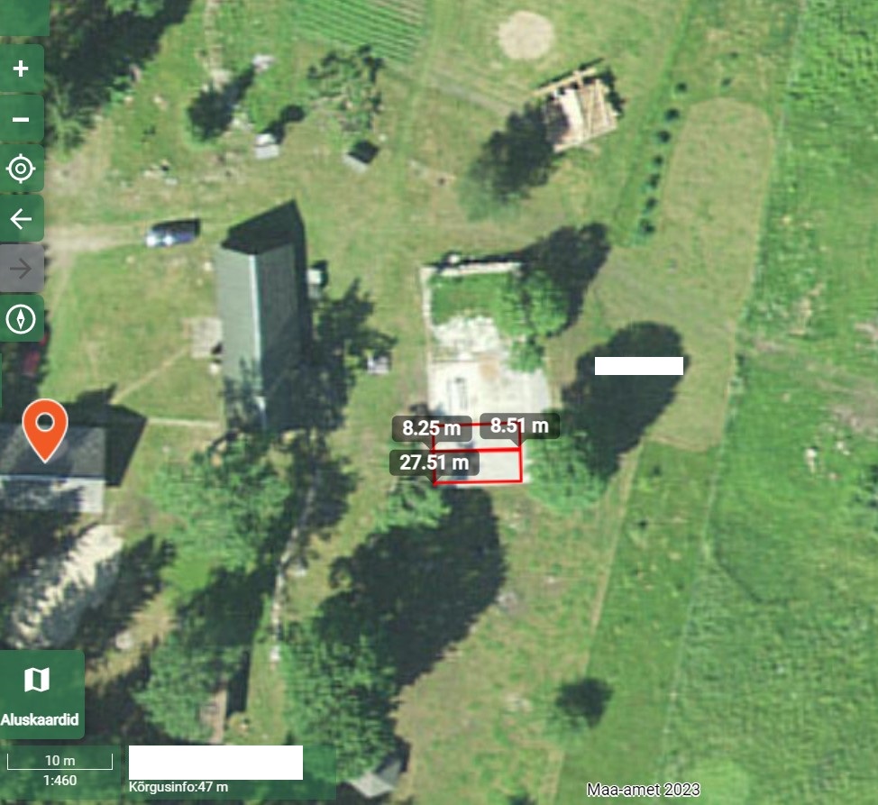 Hetkel on hoone ajutiselt paigutatud (soojustuseta üles laotud) samale kinnistule. Kõik mõõtmised tuleks teostada paikselt -minu antud mõõdud on ehituslikult ebatäpsed.